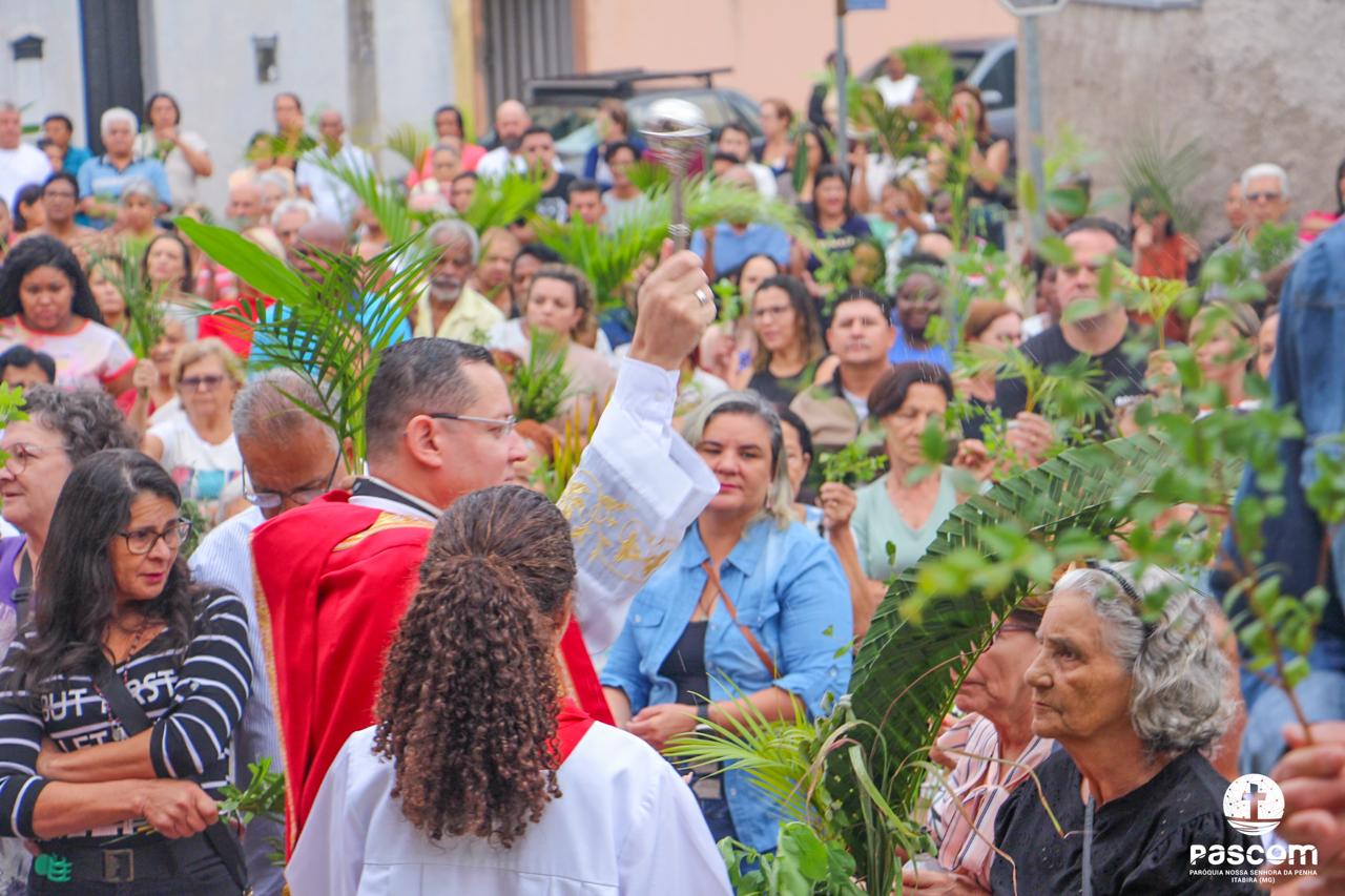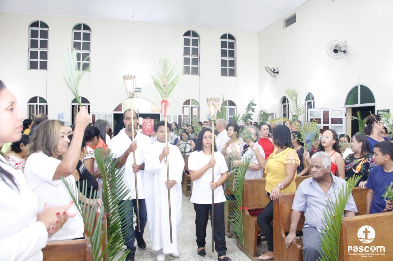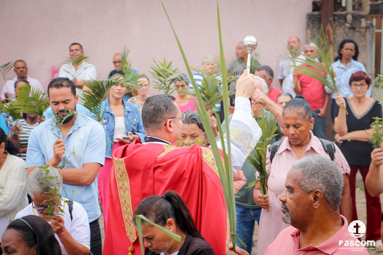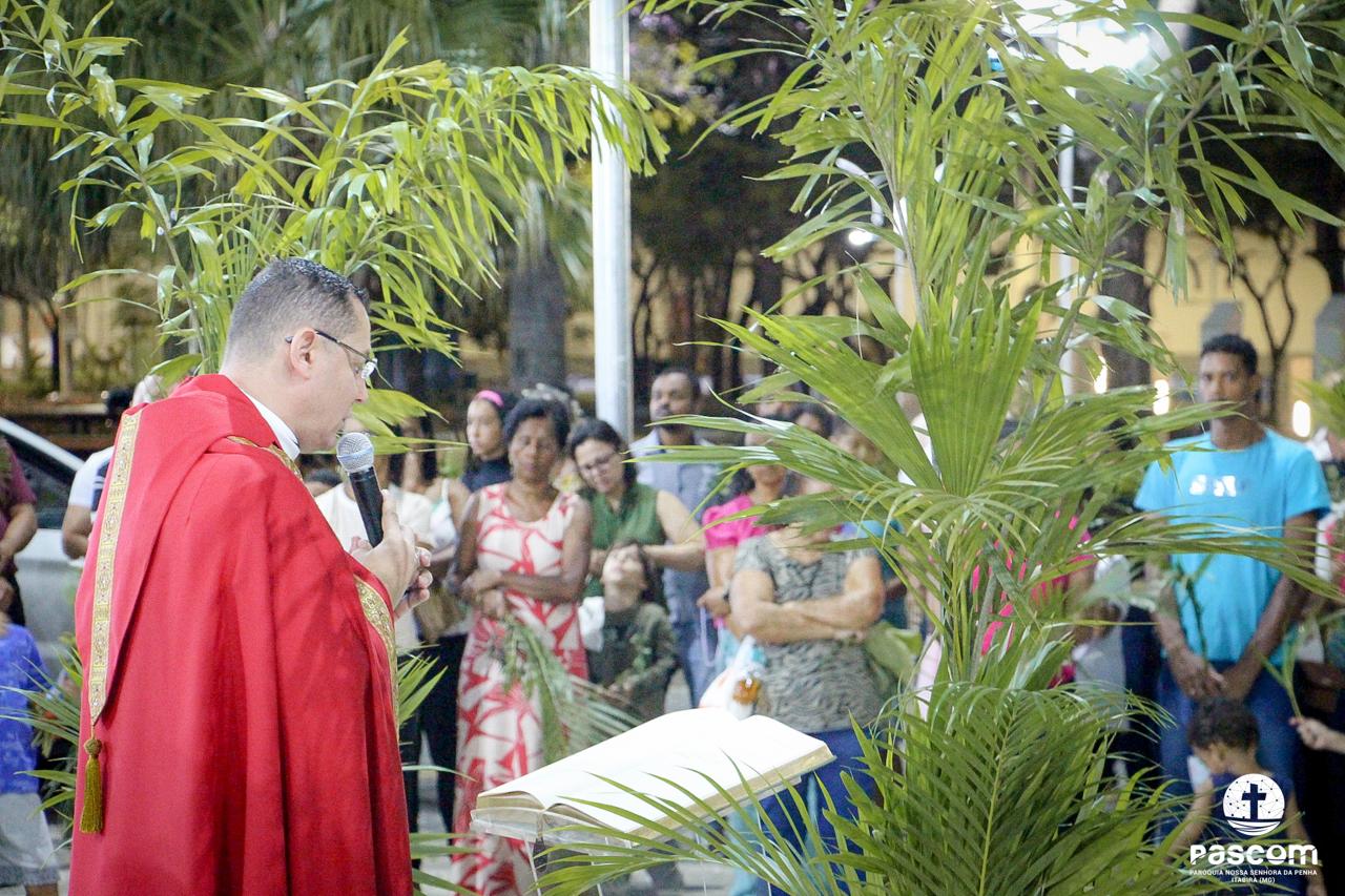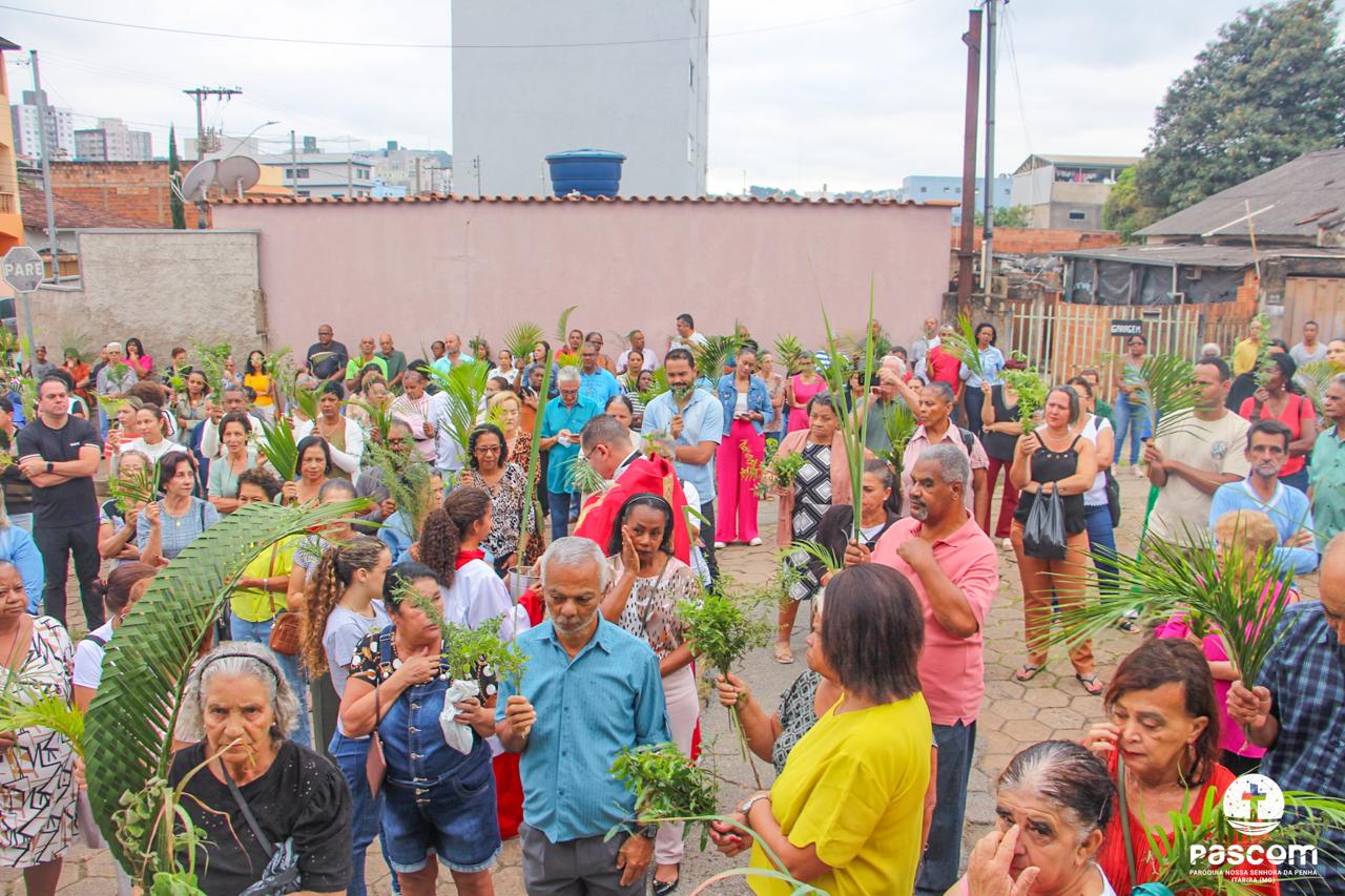 A Paróquia Nossa Senhora da Penha celebrou no último dia 13 de abril, o Domingo de Ramos da Paixão do Senhor. Esta celebração dá início à Semana Santa, onde nos convida a vivenciar com mais fervor o mistério do amor de Deus, através da Paixão, Morte e Ressurreição de Jesus. No Domingo de Ramos, contemplamos a Entrada Triunfal do Senhor em Jerusalém como Rei de Israel, nos chamando a também proclamarmos o senhorio de Cristo em nossa vida. Vários fiéis participaram da procissão e celebração eucarística, levando ramos para serem abençoados.