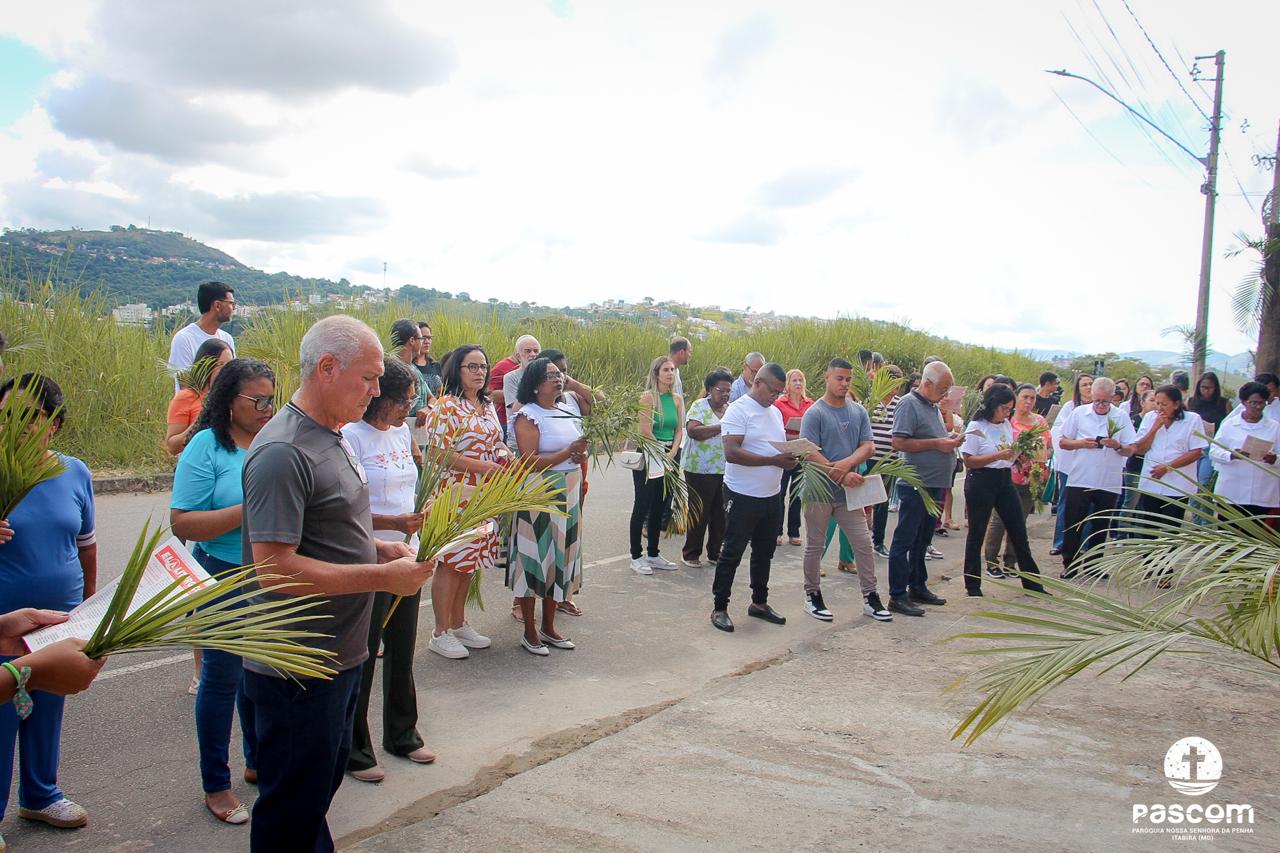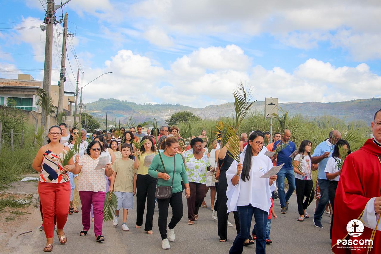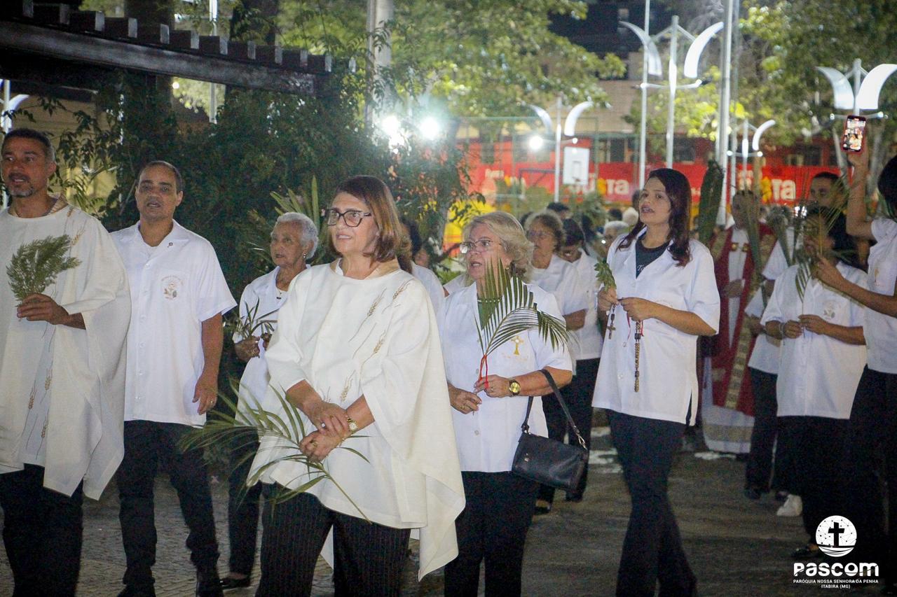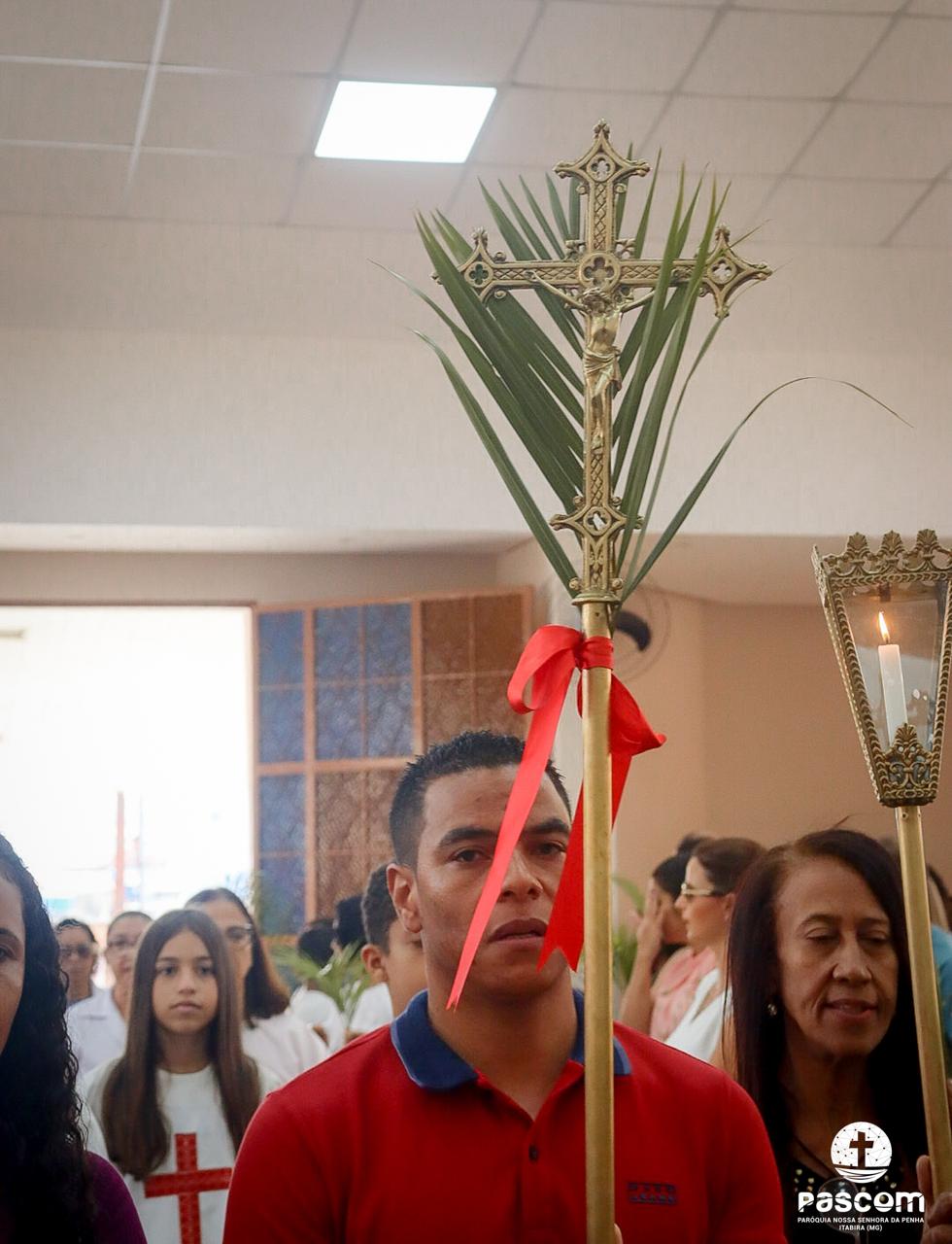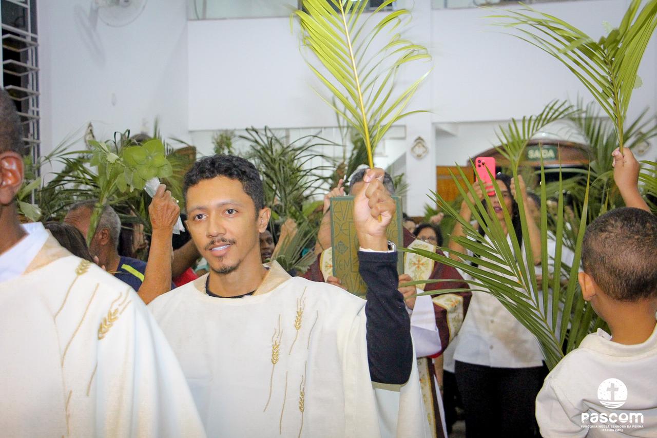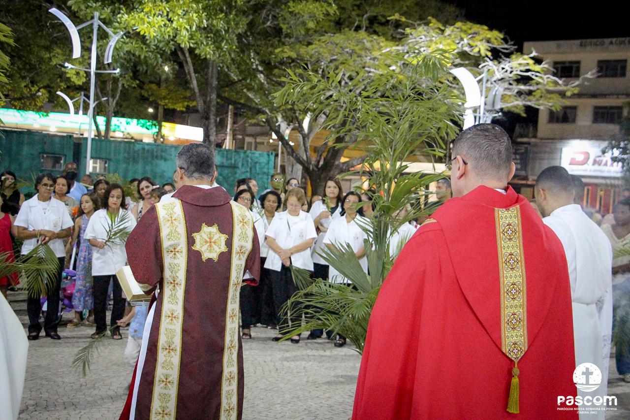 A Paróquia Nossa Senhora da Penha celebrou no último dia 13 de abril, o Domingo de Ramos da Paixão do Senhor. Esta celebração dá início à Semana Santa, onde nos convida a vivenciar com mais fervor o mistério do amor de Deus, através da Paixão, Morte e Ressurreição de Jesus. No Domingo de Ramos, contemplamos a Entrada Triunfal do Senhor em Jerusalém como Rei de Israel, nos chamando a também proclamarmos o senhorio de Cristo em nossa vida. Vários fiéis participaram da procissão e celebração eucarística, levando ramos para serem abençoados.