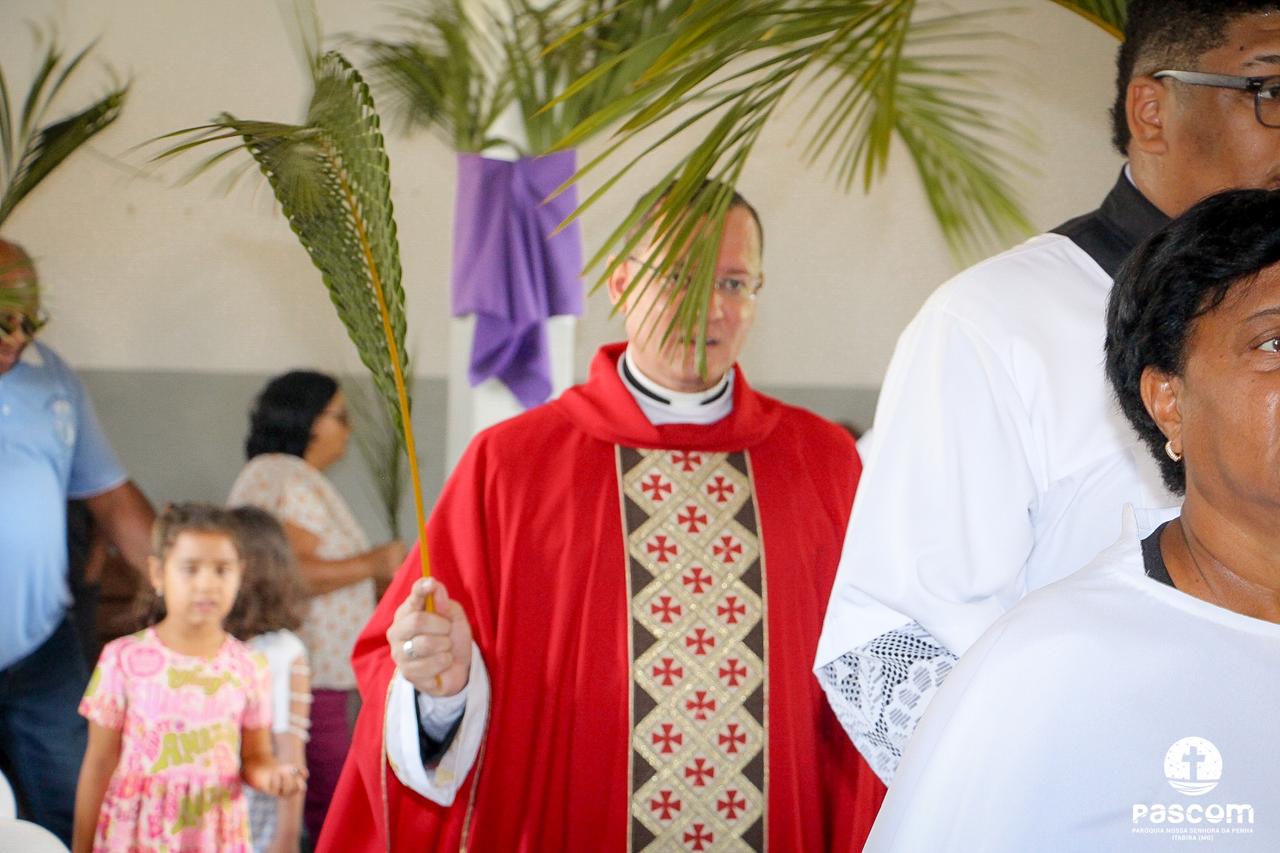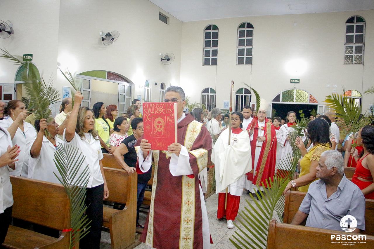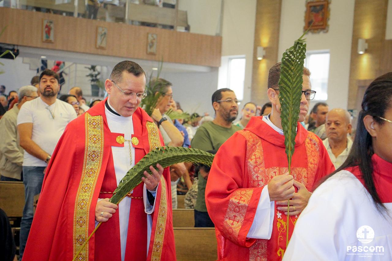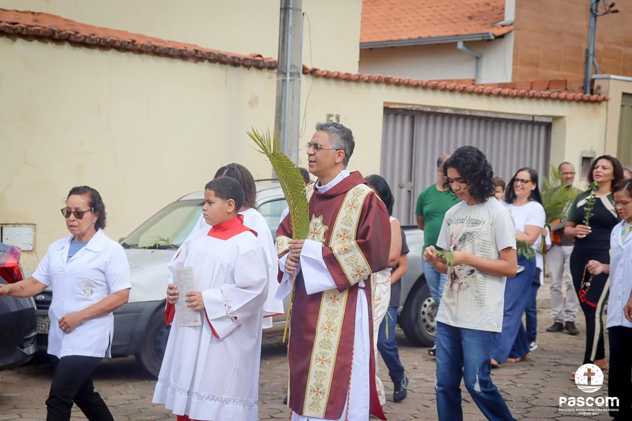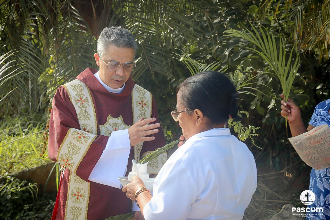 A Paróquia Nossa Senhora da Penha celebrou no último dia 13 de abril, o Domingo de Ramos da Paixão do Senhor. Esta celebração dá início à Semana Santa, onde nos convida a vivenciar com mais fervor o mistério do amor de Deus, através da Paixão, Morte e Ressurreição de Jesus. No Domingo de Ramos, contemplamos a Entrada Triunfal do Senhor em Jerusalém como Rei de Israel, nos chamando a também proclamarmos o senhorio de Cristo em nossa vida. Vários fiéis participaram da procissão e celebração eucarística, levando ramos para serem abençoados.