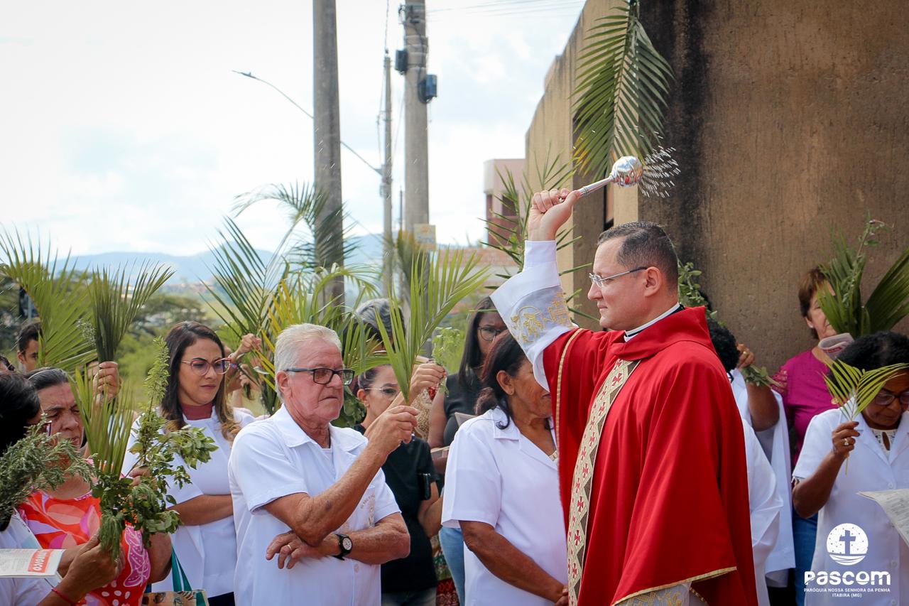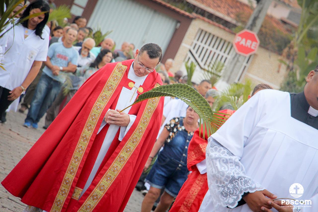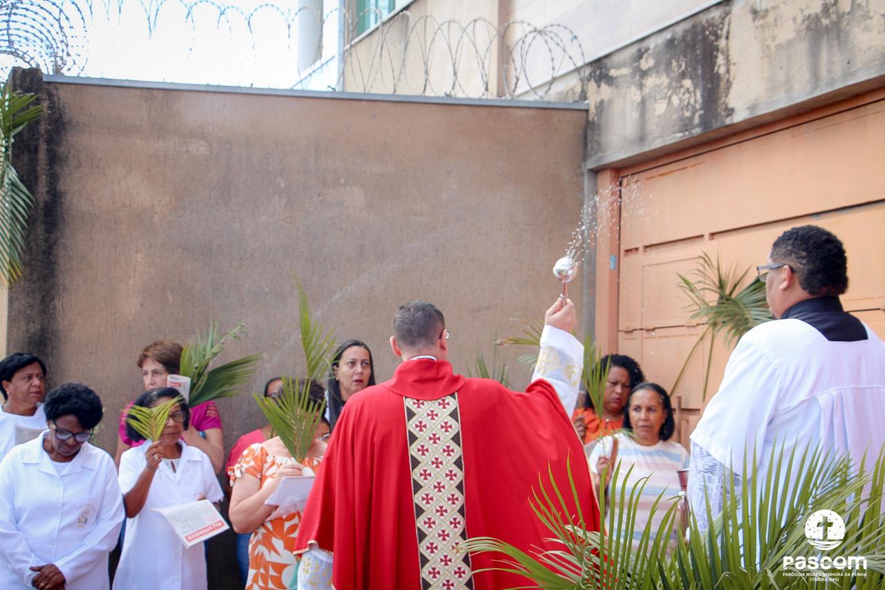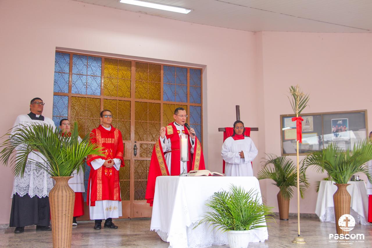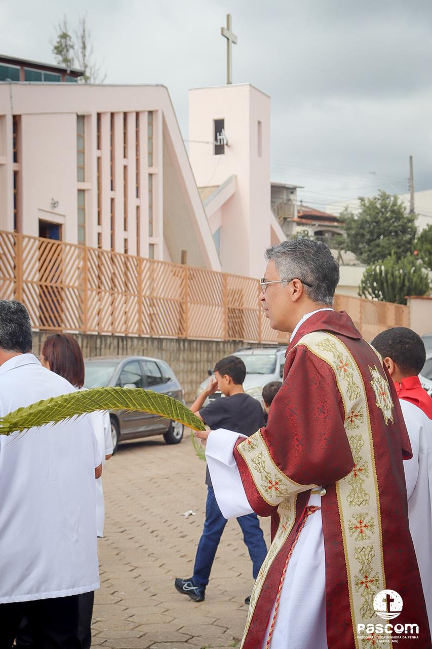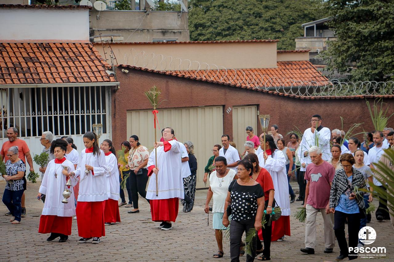 A Paróquia Nossa Senhora da Penha celebrou no último dia 13 de abril, o Domingo de Ramos da Paixão do Senhor. Esta celebração dá início à Semana Santa, onde nos convida a vivenciar com mais fervor o mistério do amor de Deus, através da Paixão, Morte e Ressurreição de Jesus. No Domingo de Ramos, contemplamos a Entrada Triunfal do Senhor em Jerusalém como Rei de Israel, nos chamando a também proclamarmos o senhorio de Cristo em nossa vida. Vários fiéis participaram da procissão e celebração eucarística, levando ramos para serem abençoados.