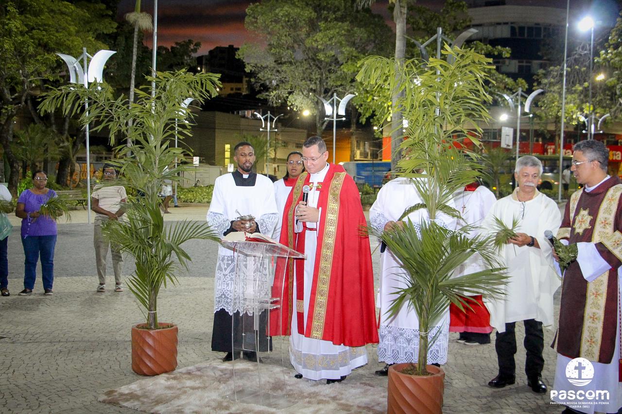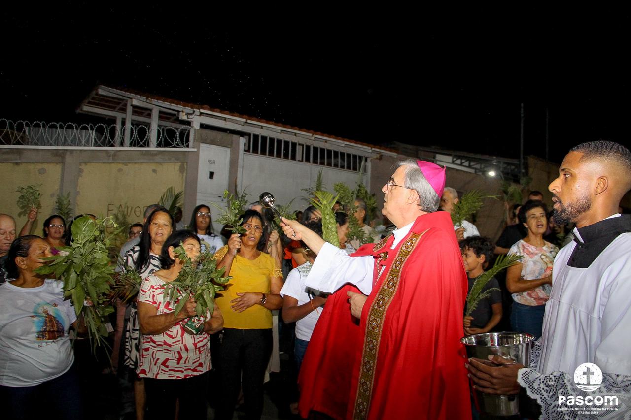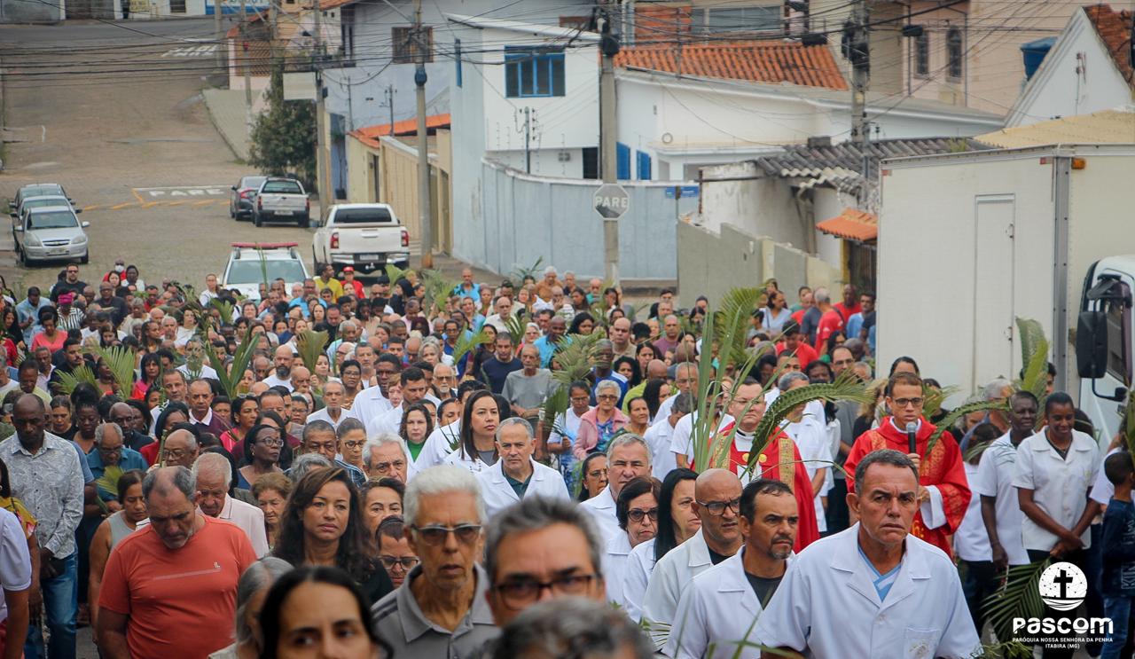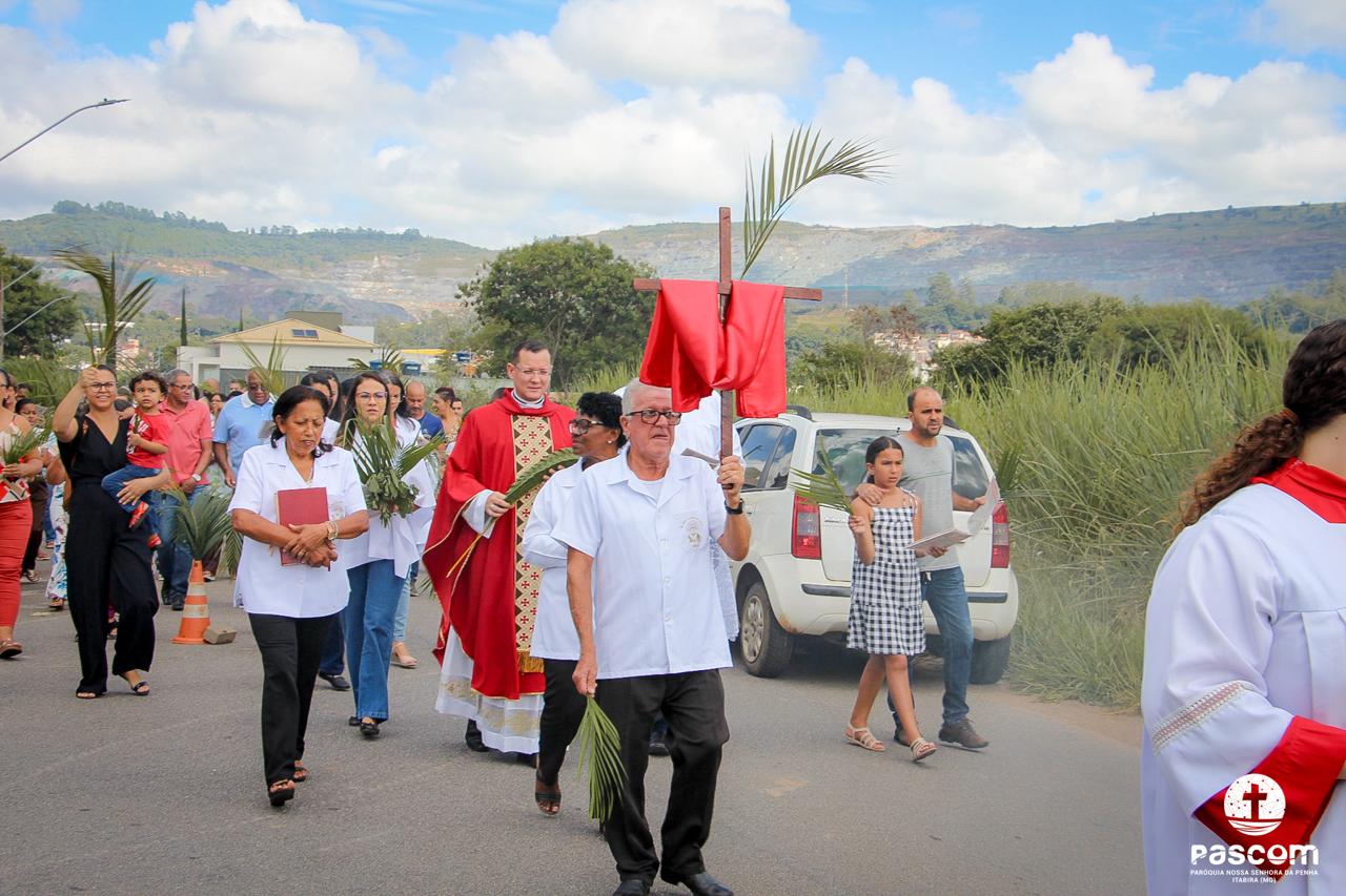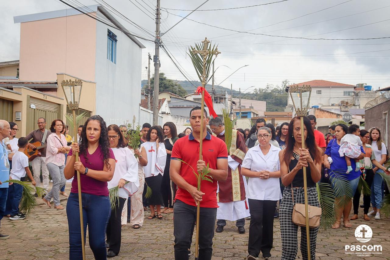 A Paróquia Nossa Senhora da Penha celebrou no último dia 13 de abril, o Domingo de Ramos da Paixão do Senhor. Esta celebração dá início à Semana Santa, onde nos convida a vivenciar com mais fervor o mistério do amor de Deus, através da Paixão, Morte e Ressurreição de Jesus. No Domingo de Ramos, contemplamos a Entrada Triunfal do Senhor em Jerusalém como Rei de Israel, nos chamando a também proclamarmos o senhorio de Cristo em nossa vida. Vários fiéis participaram da procissão e celebração eucarística, levando ramos para serem abençoados.