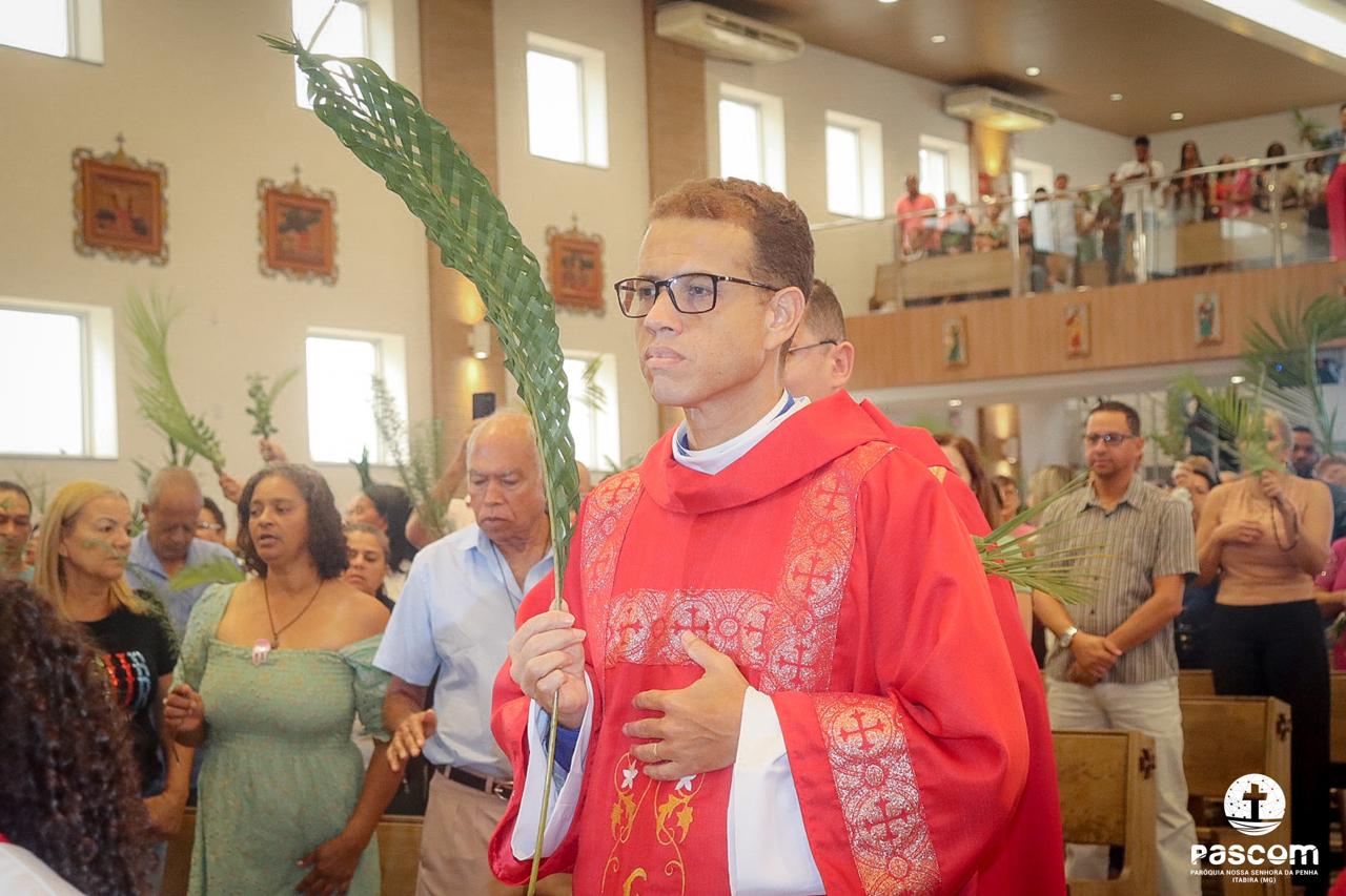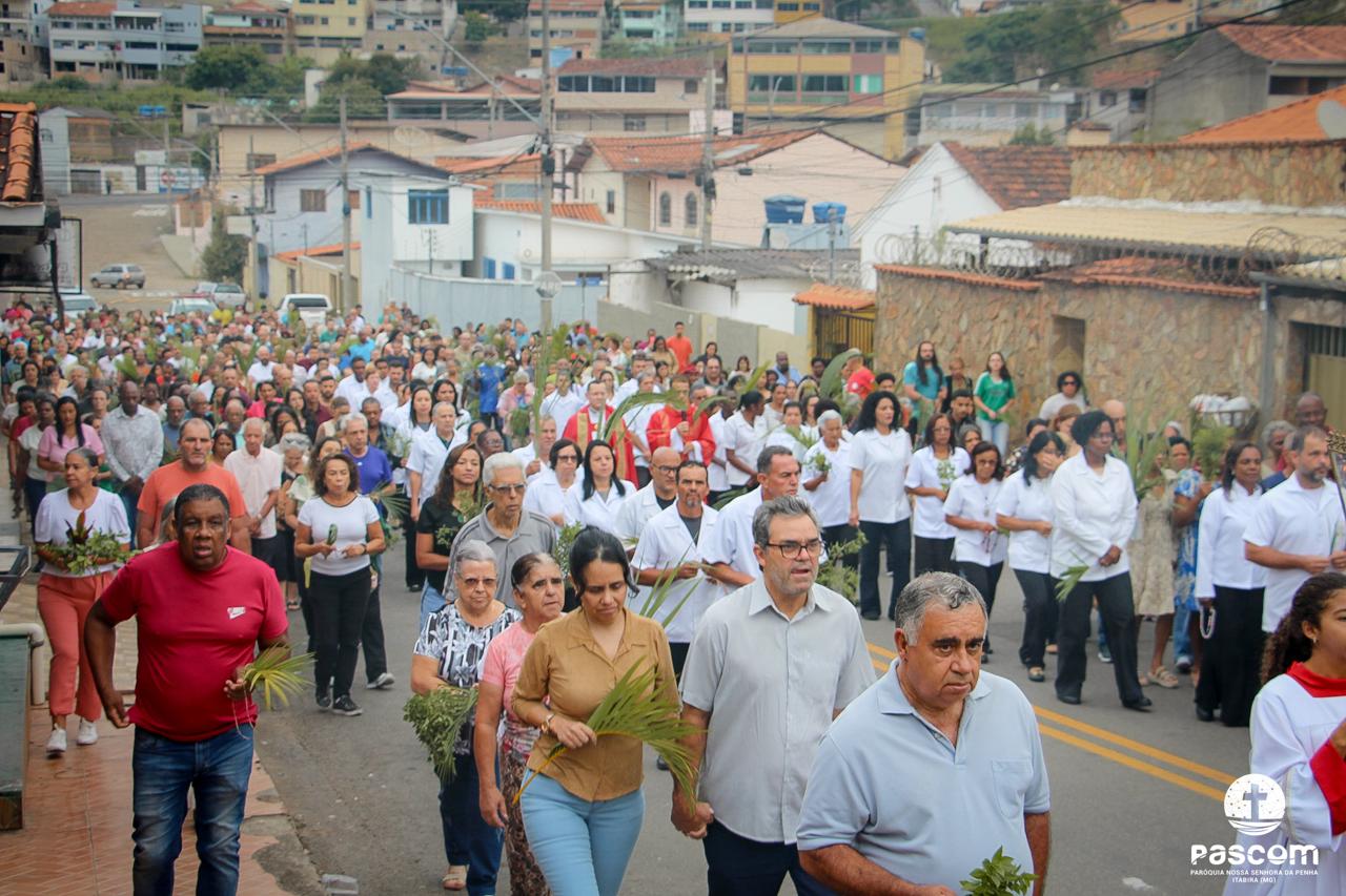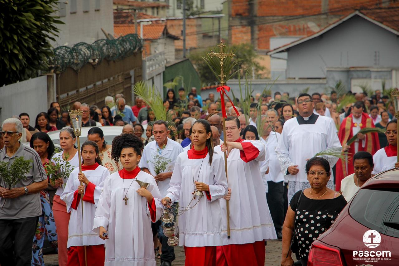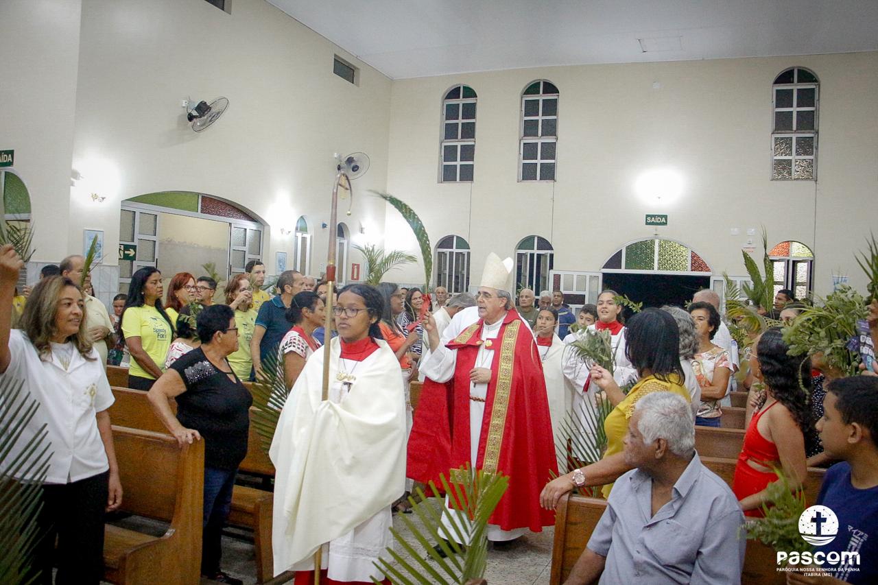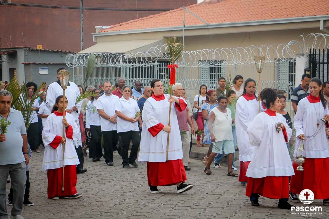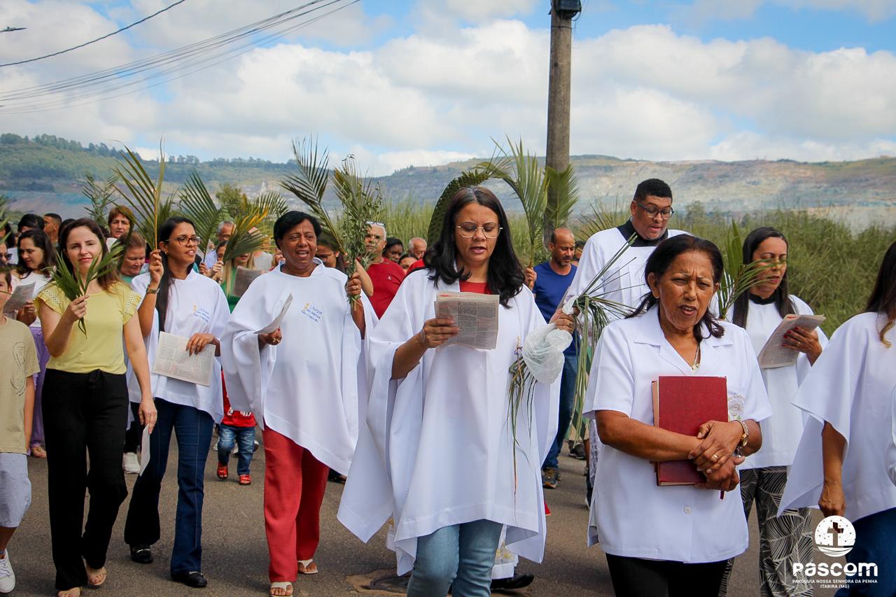 A Paróquia Nossa Senhora da Penha celebrou no último dia 13 de abril, o Domingo de Ramos da Paixão do Senhor. Esta celebração dá início à Semana Santa, onde nos convida a vivenciar com mais fervor o mistério do amor de Deus, através da Paixão, Morte e Ressurreição de Jesus. No Domingo de Ramos, contemplamos a Entrada Triunfal do Senhor em Jerusalém como Rei de Israel, nos chamando a também proclamarmos o senhorio de Cristo em nossa vida. Vários fiéis participaram da procissão e celebração eucarística, levando ramos para serem abençoados.