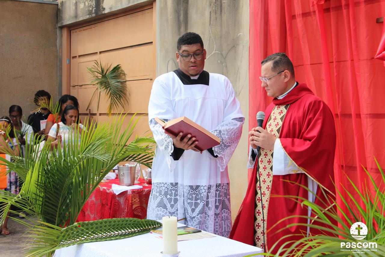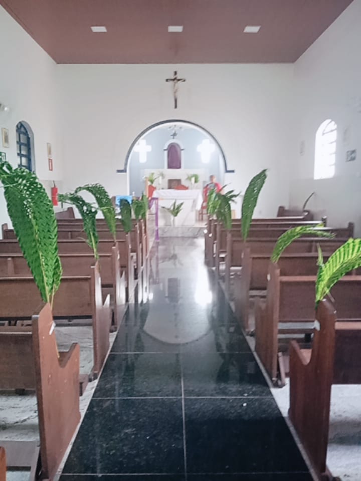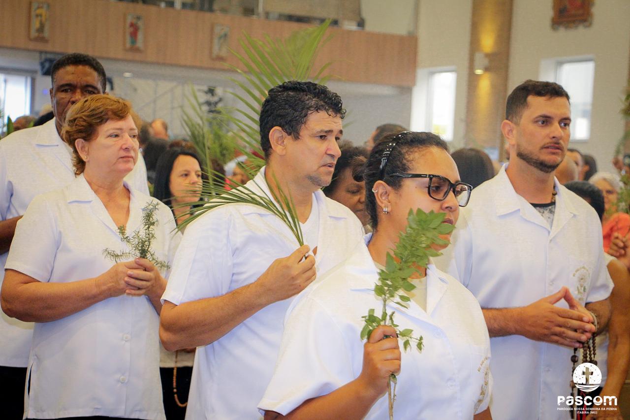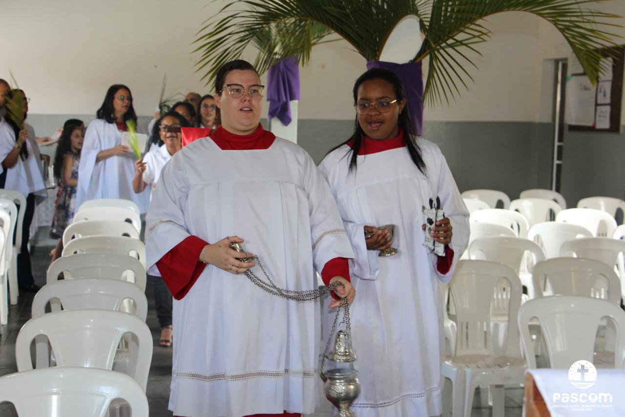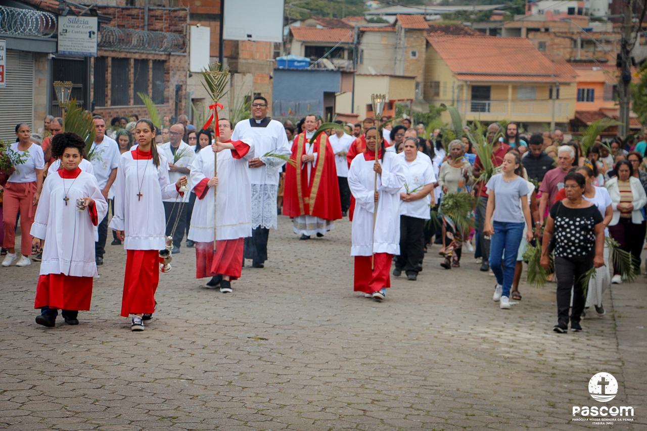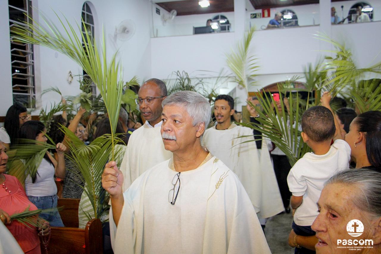 A Paróquia Nossa Senhora da Penha celebrou no último dia 13 de abril, o Domingo de Ramos da Paixão do Senhor. Esta celebração dá início à Semana Santa, onde nos convida a vivenciar com mais fervor o mistério do amor de Deus, através da Paixão, Morte e Ressurreição de Jesus. No Domingo de Ramos, contemplamos a Entrada Triunfal do Senhor em Jerusalém como Rei de Israel, nos chamando a também proclamarmos o senhorio de Cristo em nossa vida. Vários fiéis participaram da procissão e celebração eucarística, levando ramos para serem abençoados.
