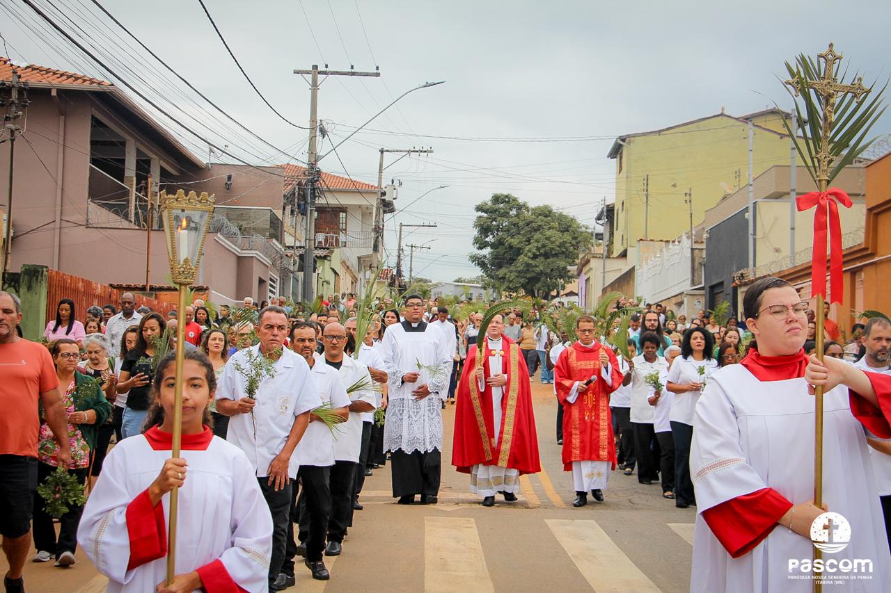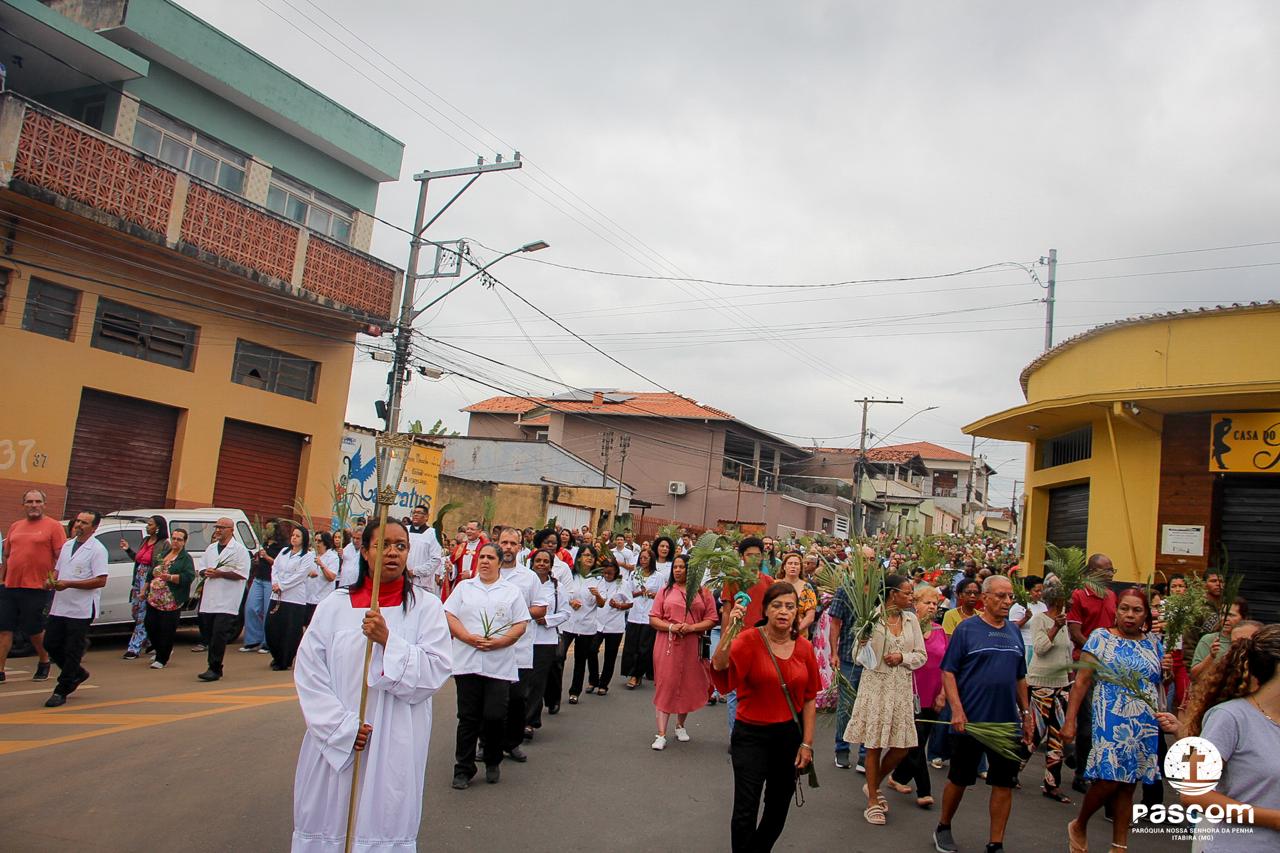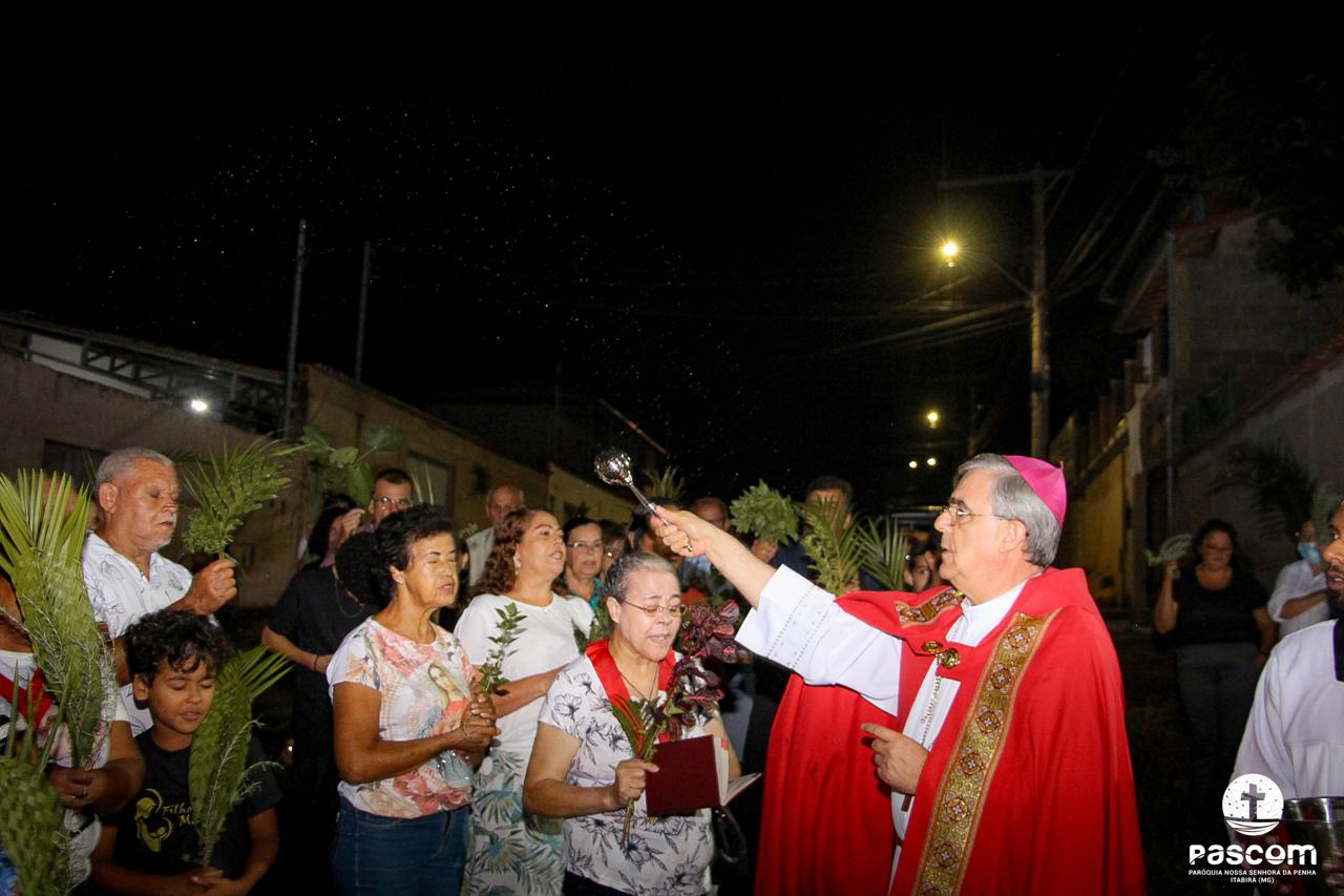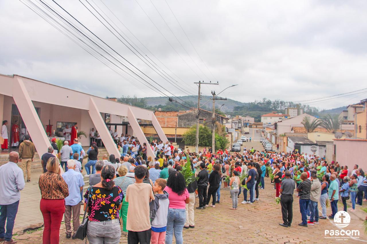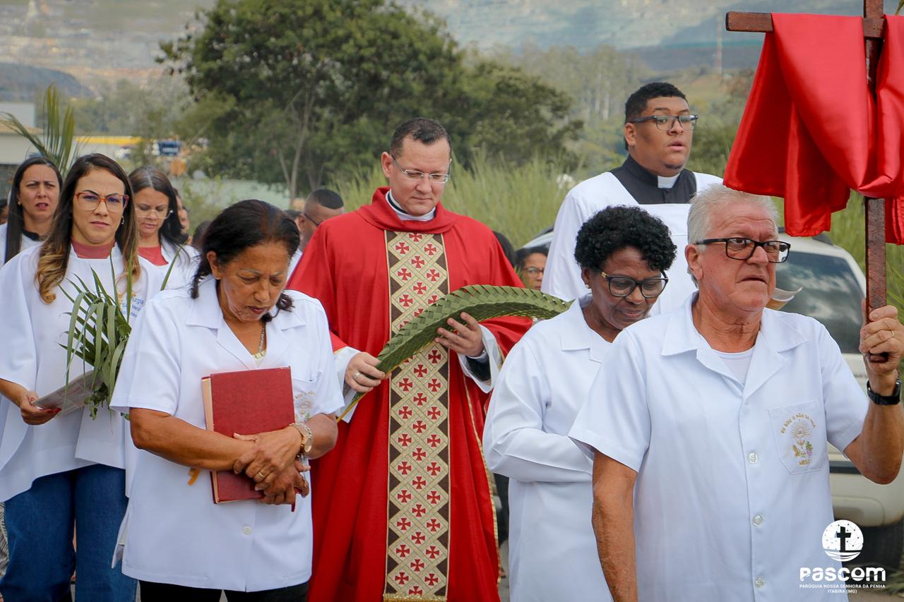 A Paróquia Nossa Senhora da Penha celebrou no último dia 13 de abril, o Domingo de Ramos da Paixão do Senhor. Esta celebração dá início à Semana Santa, onde nos convida a vivenciar com mais fervor o mistério do amor de Deus, através da Paixão, Morte e Ressurreição de Jesus. No Domingo de Ramos, contemplamos a Entrada Triunfal do Senhor em Jerusalém como Rei de Israel, nos chamando a também proclamarmos o senhorio de Cristo em nossa vida. Vários fiéis participaram da procissão e celebração eucarística, levando ramos para serem abençoados.