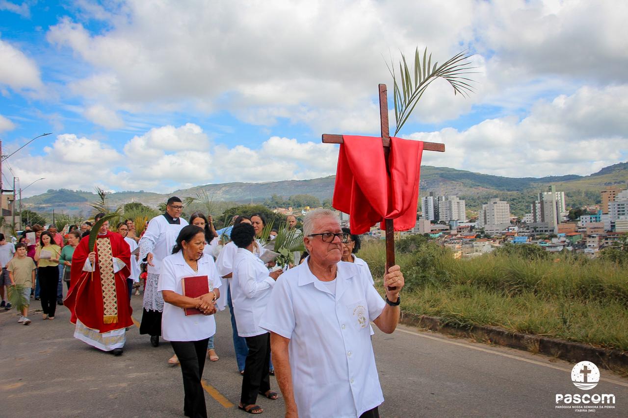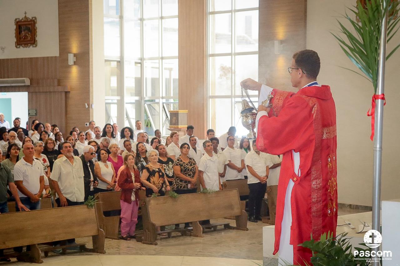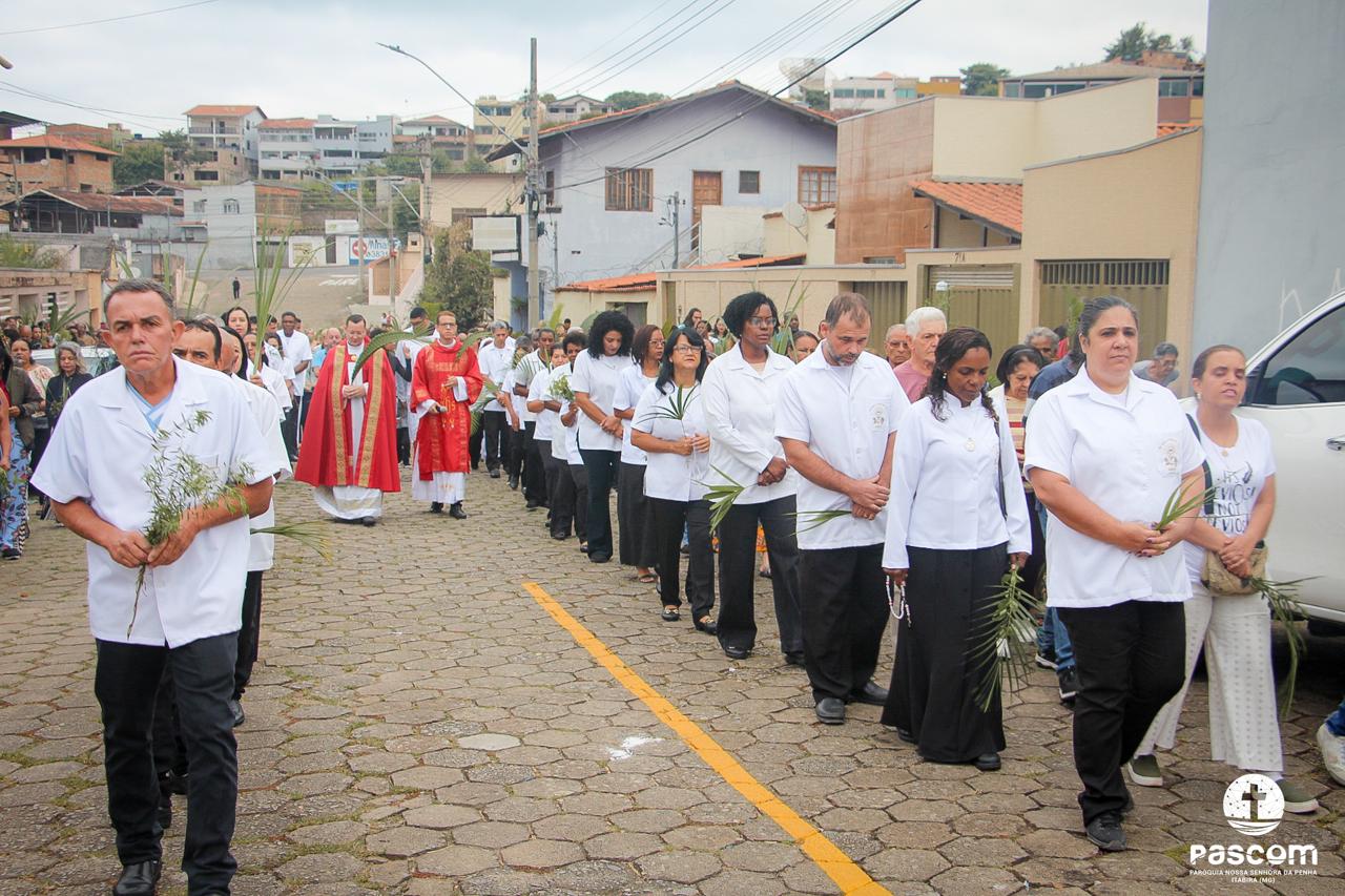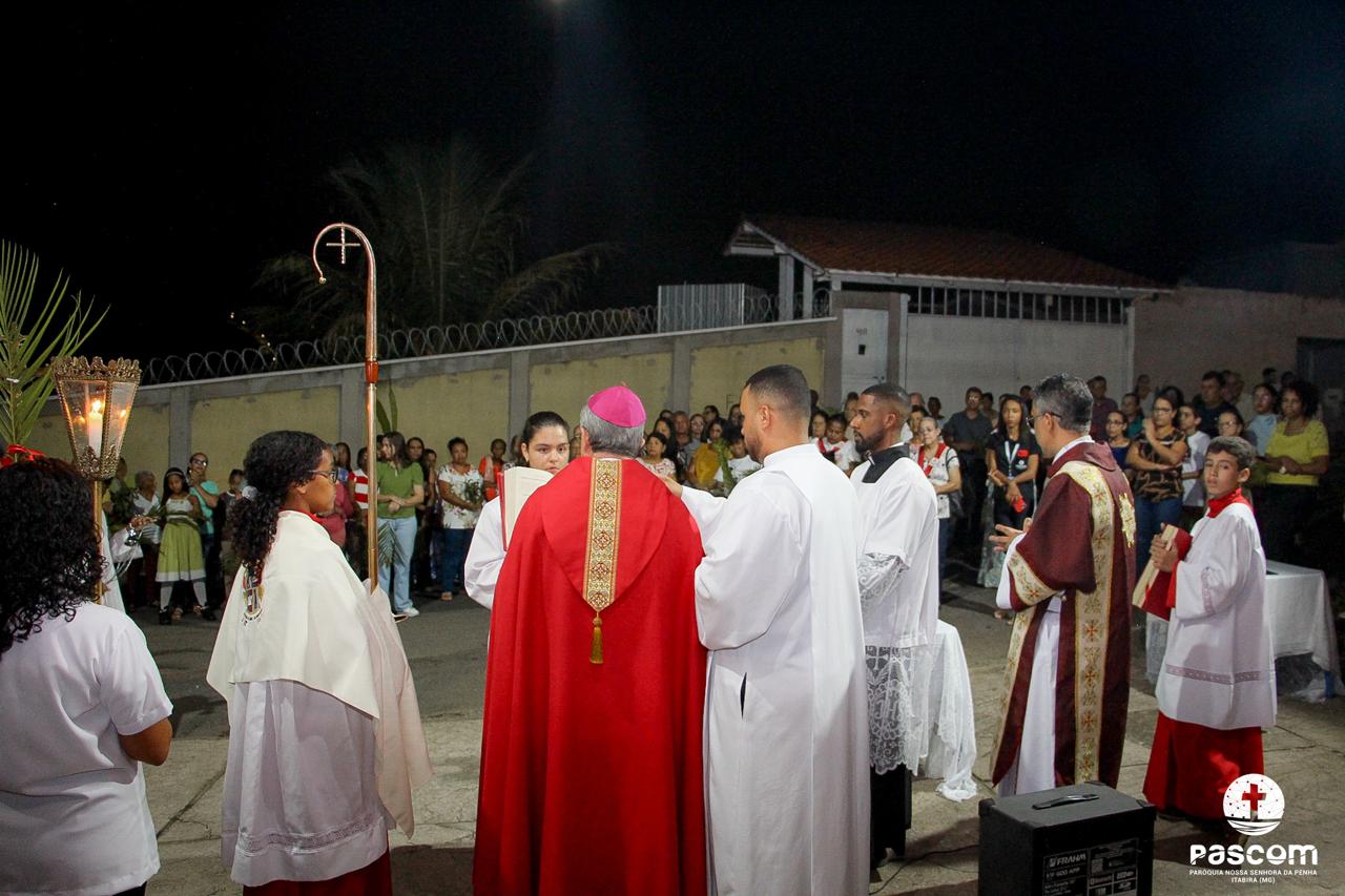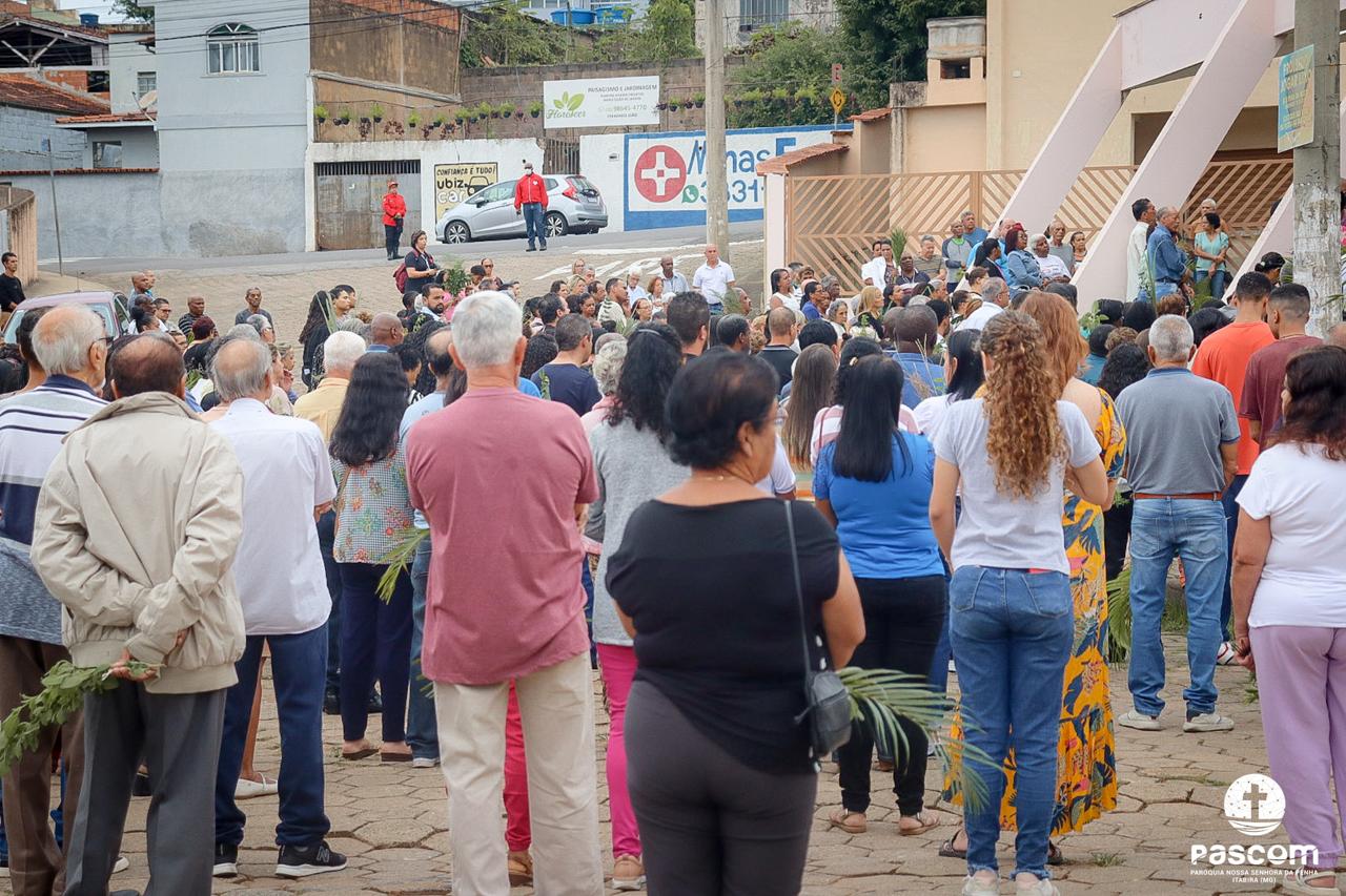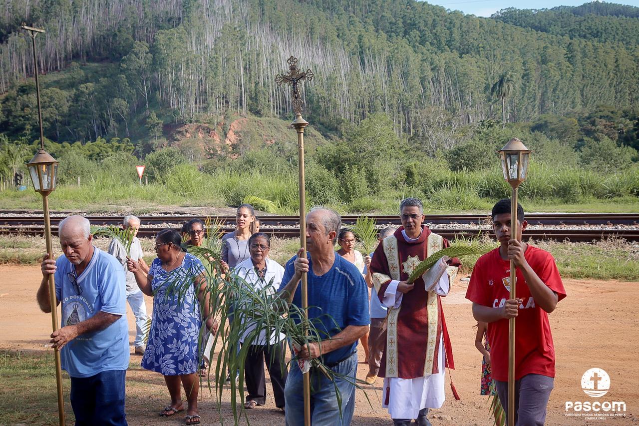 A Paróquia Nossa Senhora da Penha celebrou no último dia 13 de abril, o Domingo de Ramos da Paixão do Senhor. Esta celebração dá início à Semana Santa, onde nos convida a vivenciar com mais fervor o mistério do amor de Deus, através da Paixão, Morte e Ressurreição de Jesus. No Domingo de Ramos, contemplamos a Entrada Triunfal do Senhor em Jerusalém como Rei de Israel, nos chamando a também proclamarmos o senhorio de Cristo em nossa vida. Vários fiéis participaram da procissão e celebração eucarística, levando ramos para serem abençoados.