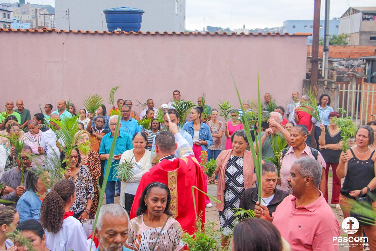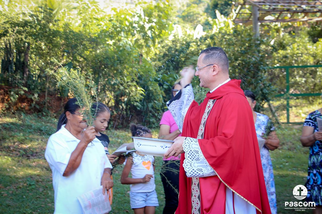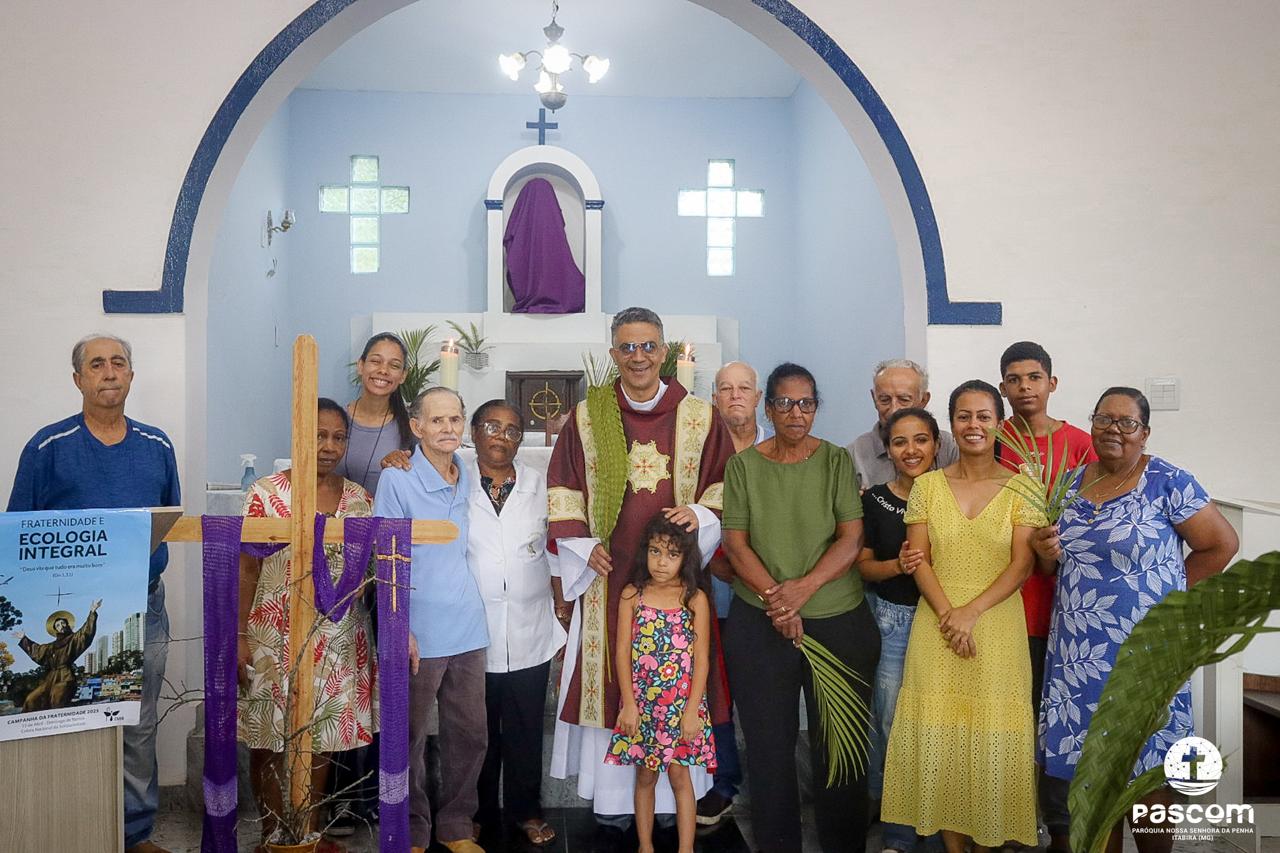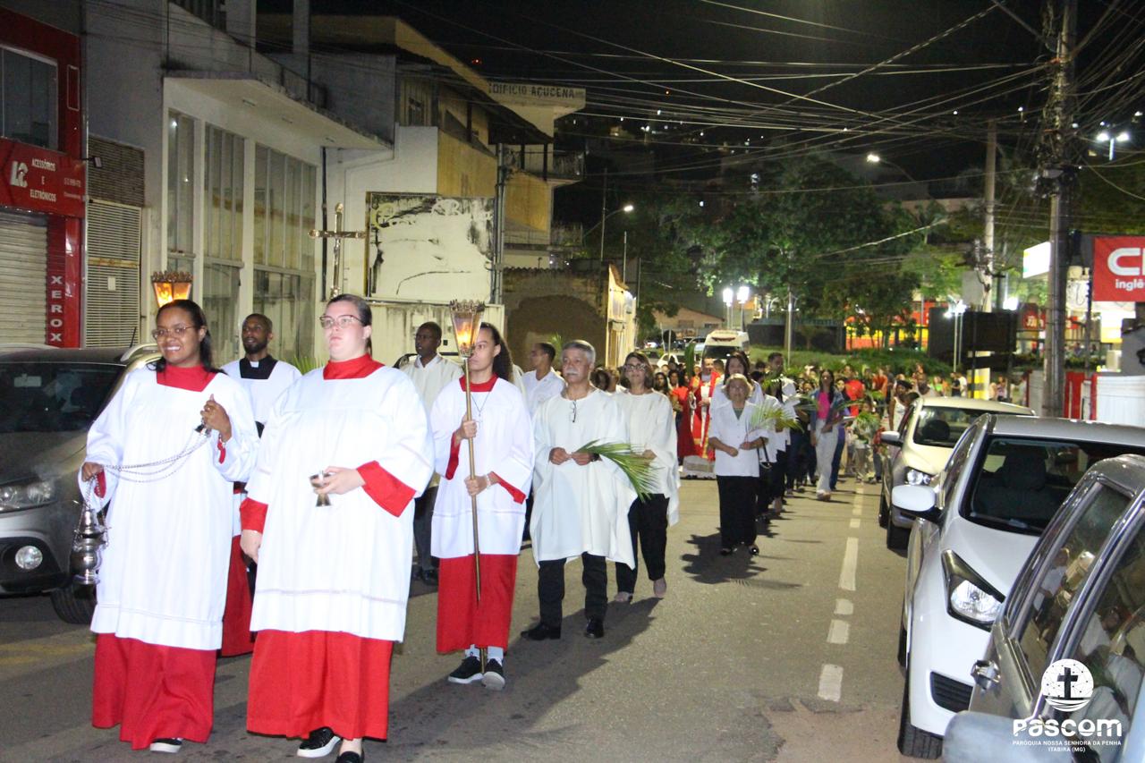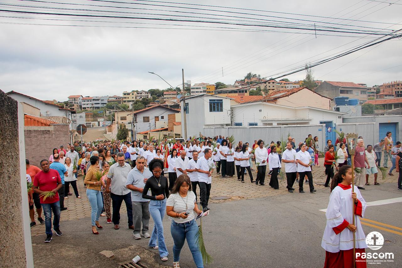 A Paróquia Nossa Senhora da Penha celebrou no último dia 13 de abril, o Domingo de Ramos da Paixão do Senhor. Esta celebração dá início à Semana Santa, onde nos convida a vivenciar com mais fervor o mistério do amor de Deus, através da Paixão, Morte e Ressurreição de Jesus. No Domingo de Ramos, contemplamos a Entrada Triunfal do Senhor em Jerusalém como Rei de Israel, nos chamando a também proclamarmos o senhorio de Cristo em nossa vida. Vários fiéis participaram da procissão e celebração eucarística, levando ramos para serem abençoados.