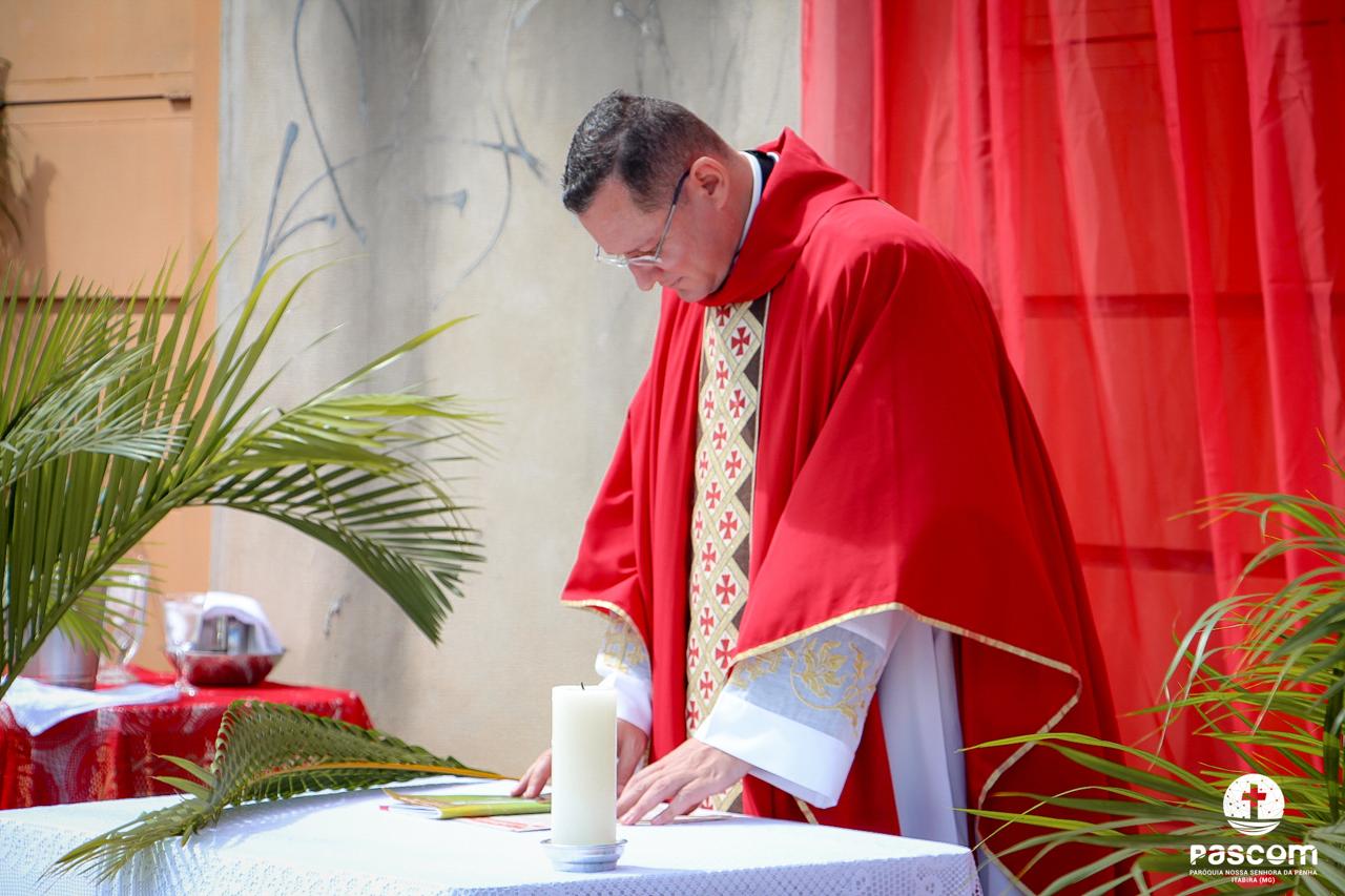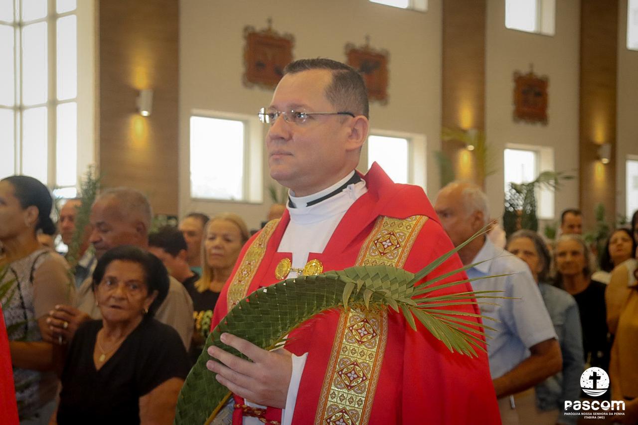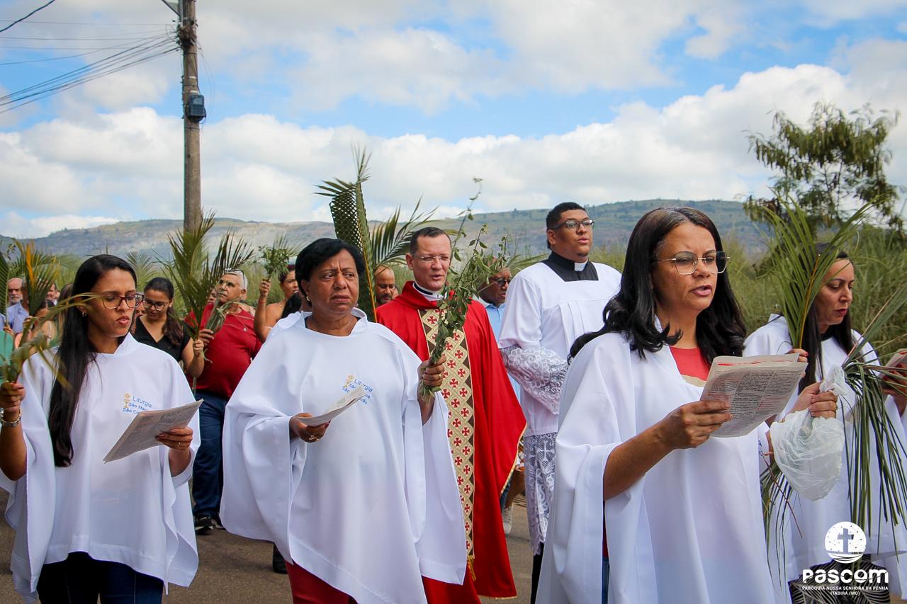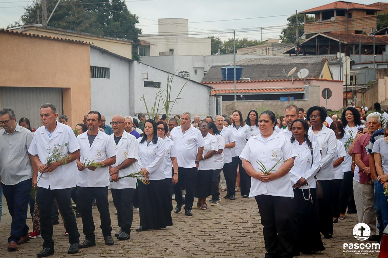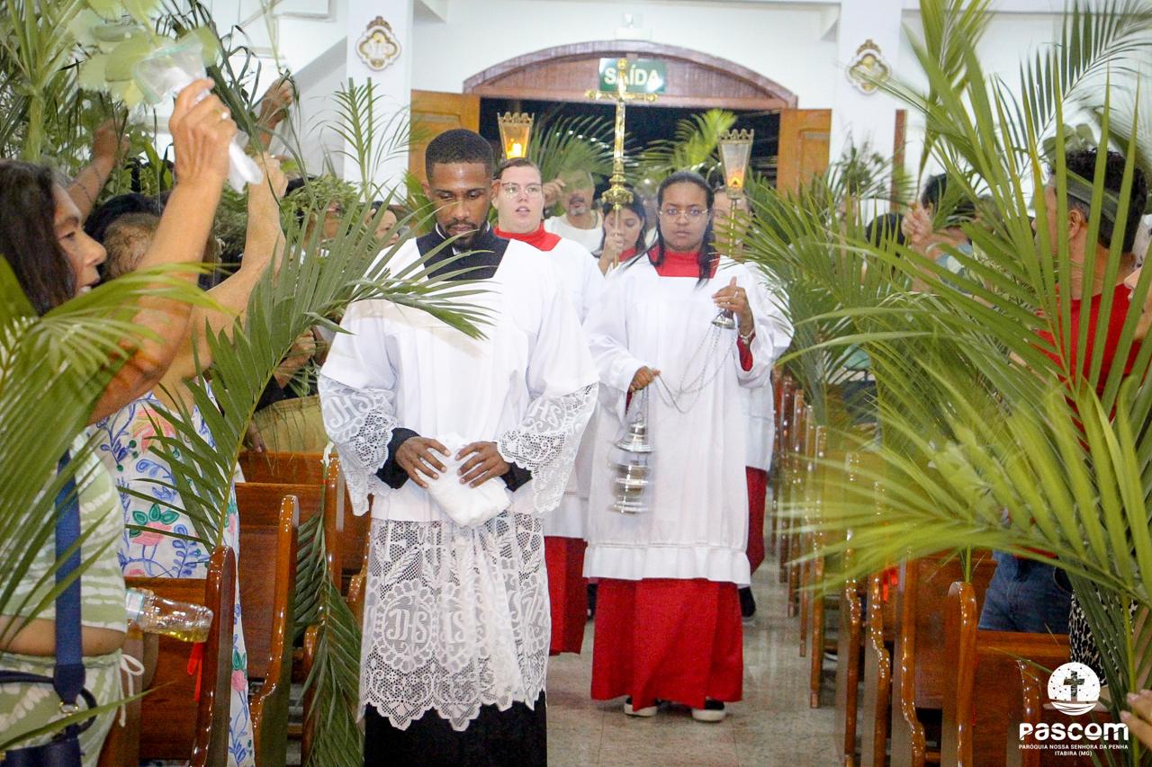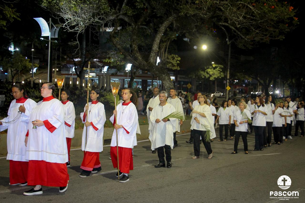 A Paróquia Nossa Senhora da Penha celebrou no último dia 13 de abril, o Domingo de Ramos da Paixão do Senhor. Esta celebração dá início à Semana Santa, onde nos convida a vivenciar com mais fervor o mistério do amor de Deus, através da Paixão, Morte e Ressurreição de Jesus. No Domingo de Ramos, contemplamos a Entrada Triunfal do Senhor em Jerusalém como Rei de Israel, nos chamando a também proclamarmos o senhorio de Cristo em nossa vida. Vários fiéis participaram da procissão e celebração eucarística, levando ramos para serem abençoados.