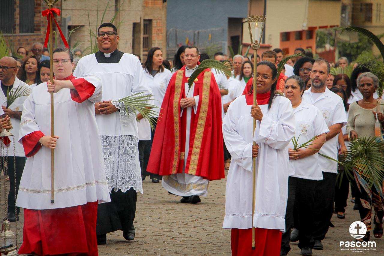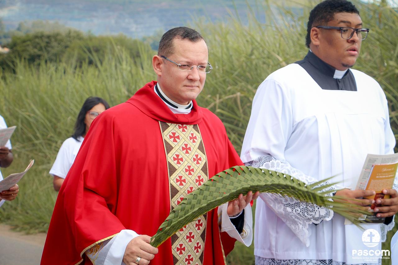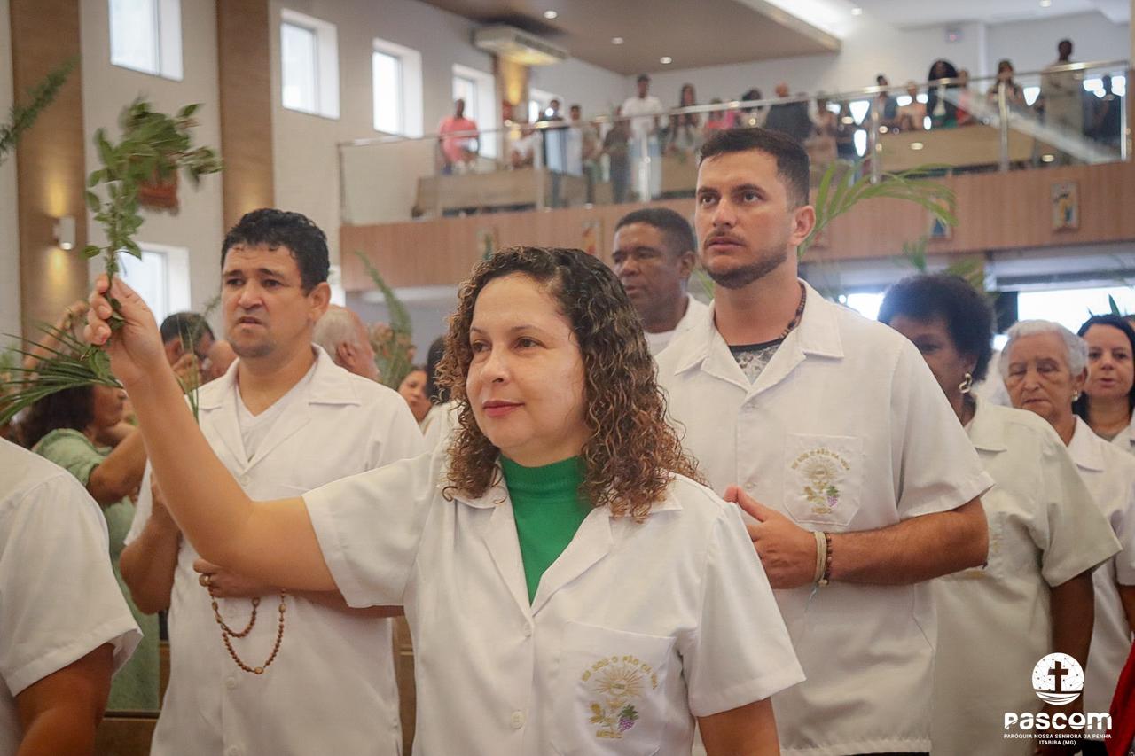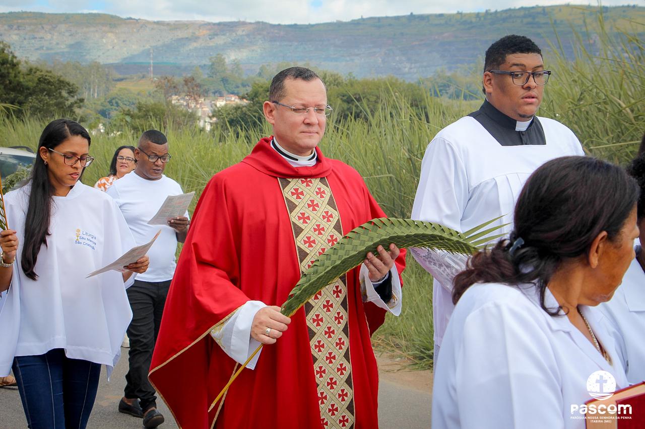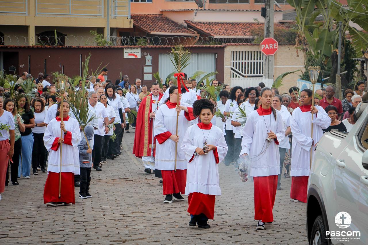 A Paróquia Nossa Senhora da Penha celebrou no último dia 13 de abril, o Domingo de Ramos da Paixão do Senhor. Esta celebração dá início à Semana Santa, onde nos convida a vivenciar com mais fervor o mistério do amor de Deus, através da Paixão, Morte e Ressurreição de Jesus. No Domingo de Ramos, contemplamos a Entrada Triunfal do Senhor em Jerusalém como Rei de Israel, nos chamando a também proclamarmos o senhorio de Cristo em nossa vida. Vários fiéis participaram da procissão e celebração eucarística, levando ramos para serem abençoados.