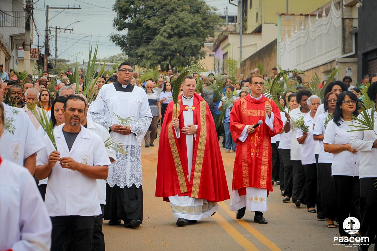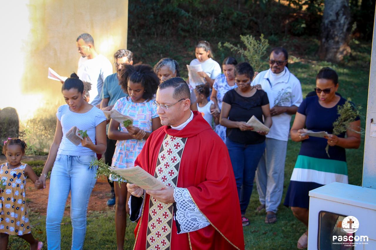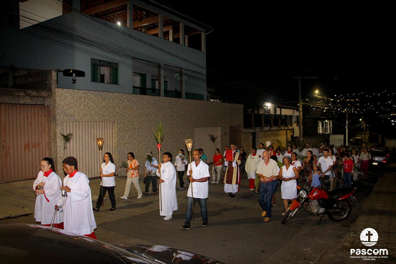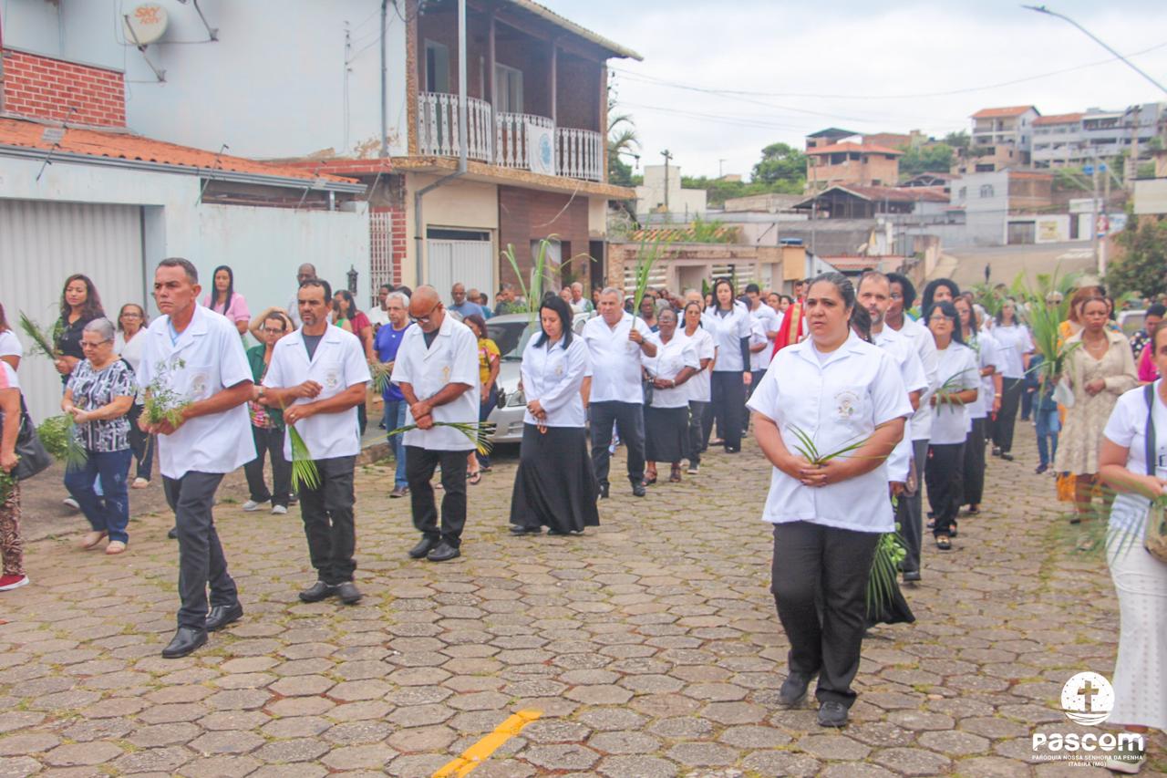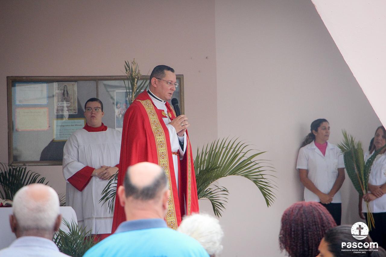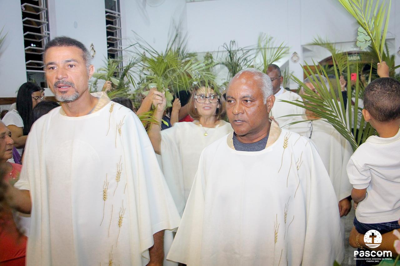 A Paróquia Nossa Senhora da Penha celebrou no último dia 13 de abril, o Domingo de Ramos da Paixão do Senhor. Esta celebração dá início à Semana Santa, onde nos convida a vivenciar com mais fervor o mistério do amor de Deus, através da Paixão, Morte e Ressurreição de Jesus. No Domingo de Ramos, contemplamos a Entrada Triunfal do Senhor em Jerusalém como Rei de Israel, nos chamando a também proclamarmos o senhorio de Cristo em nossa vida. Vários fiéis participaram da procissão e celebração eucarística, levando ramos para serem abençoados.