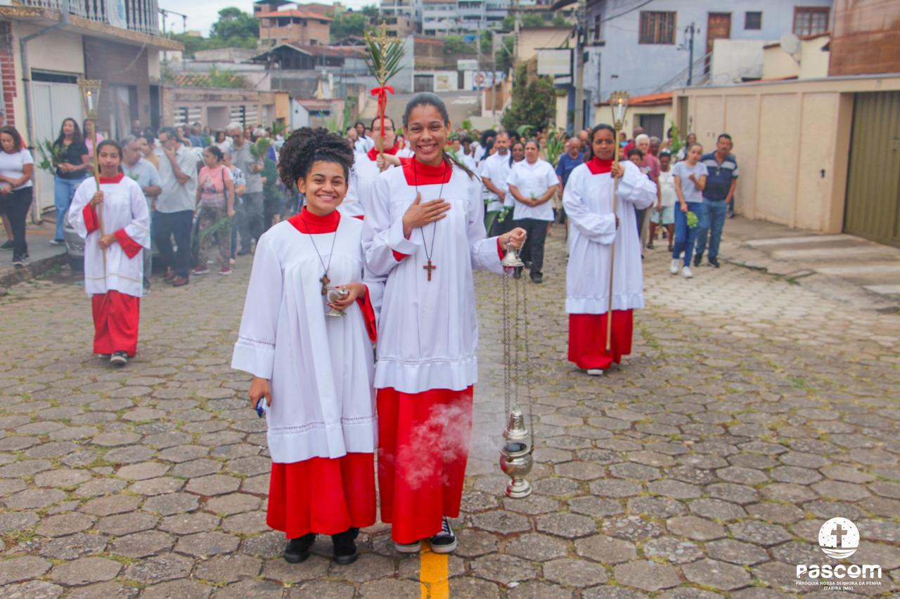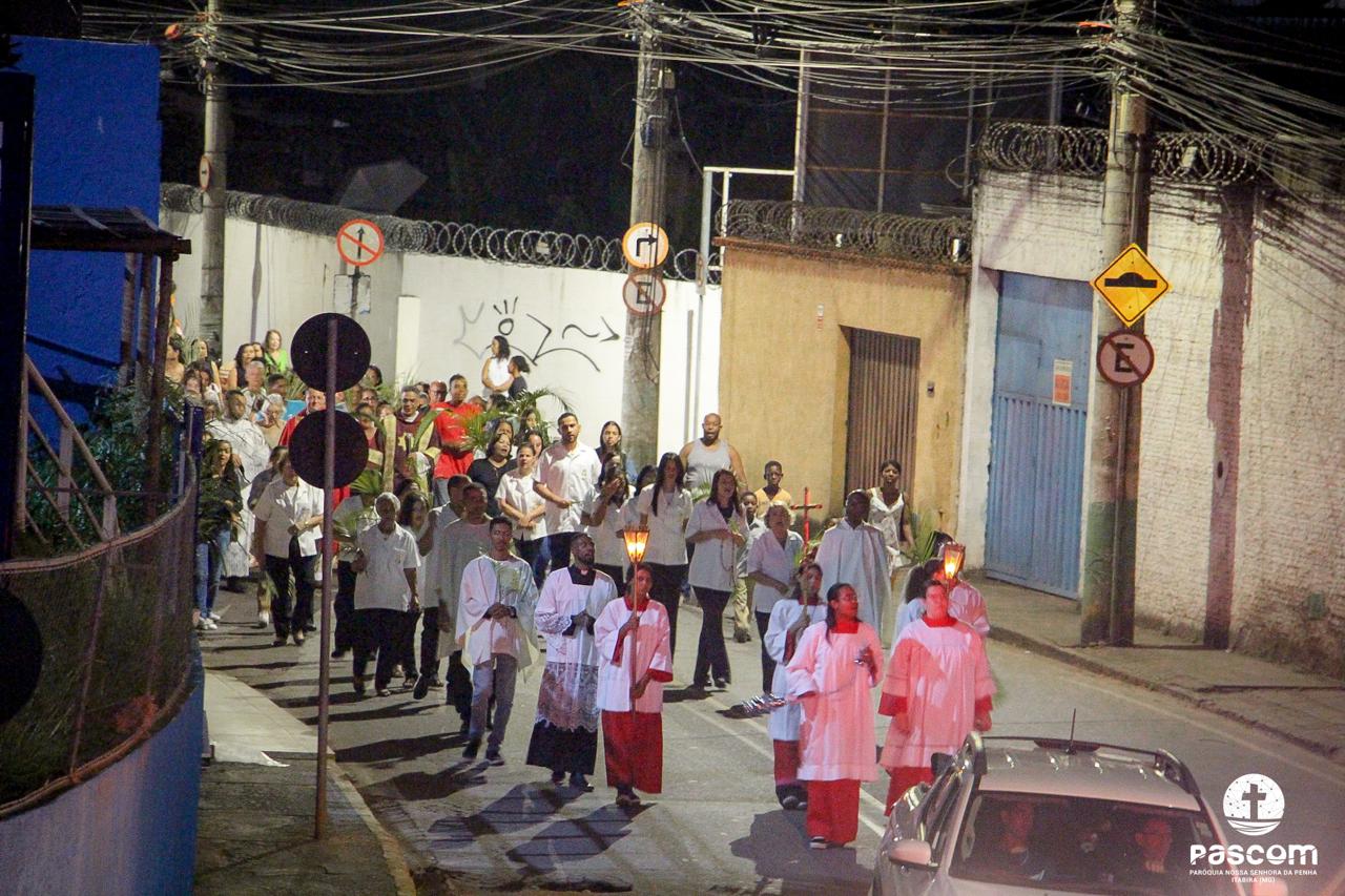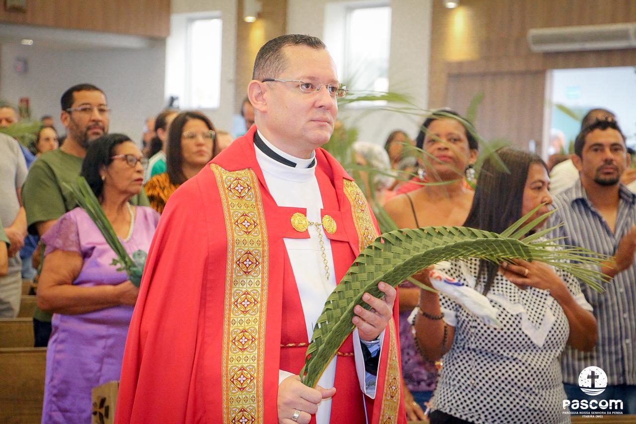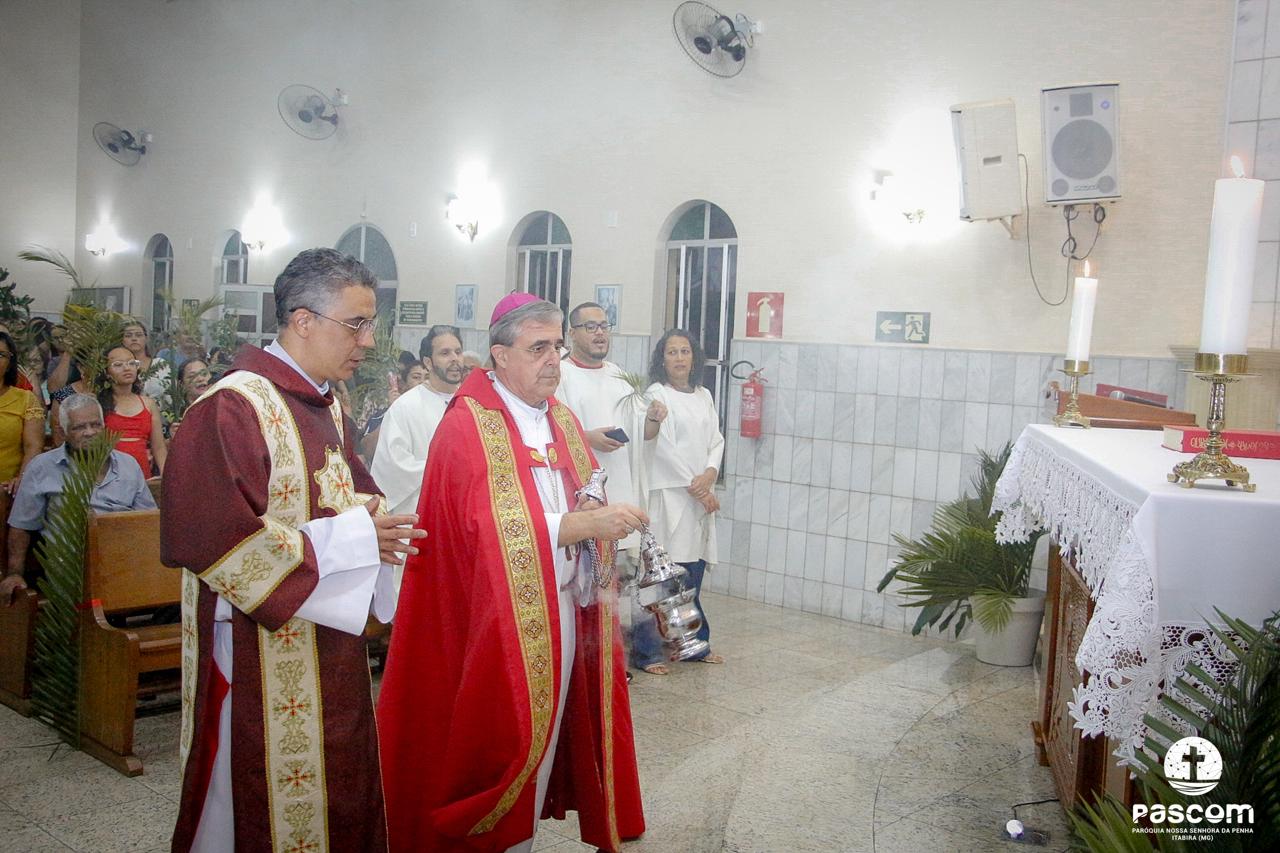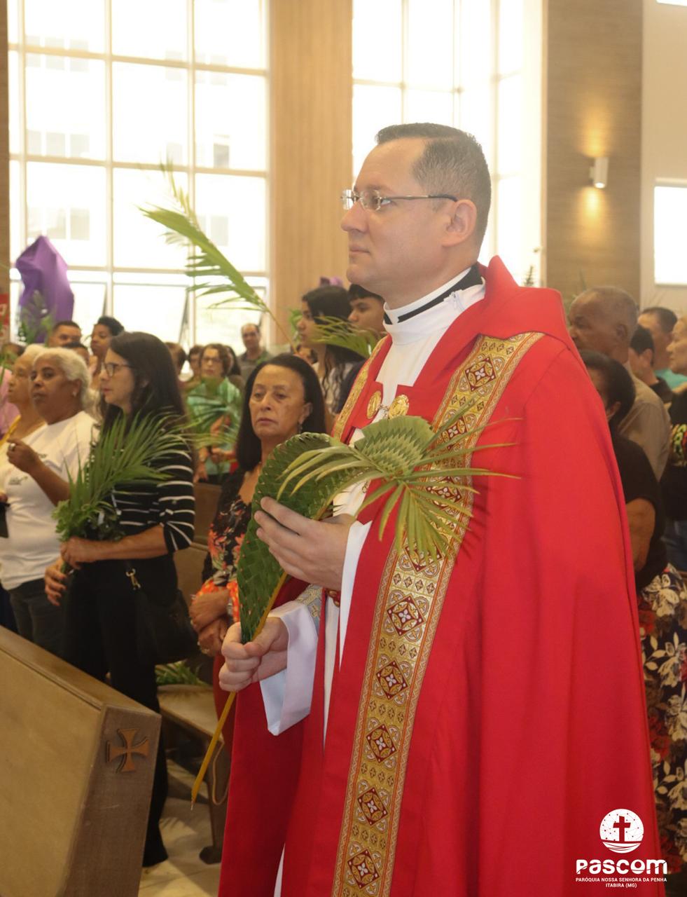 A Paróquia Nossa Senhora da Penha celebrou no último dia 13 de abril, o Domingo de Ramos da Paixão do Senhor. Esta celebração dá início à Semana Santa, onde nos convida a vivenciar com mais fervor o mistério do amor de Deus, através da Paixão, Morte e Ressurreição de Jesus. No Domingo de Ramos, contemplamos a Entrada Triunfal do Senhor em Jerusalém como Rei de Israel, nos chamando a também proclamarmos o senhorio de Cristo em nossa vida. Vários fiéis participaram da procissão e celebração eucarística, levando ramos para serem abençoados.