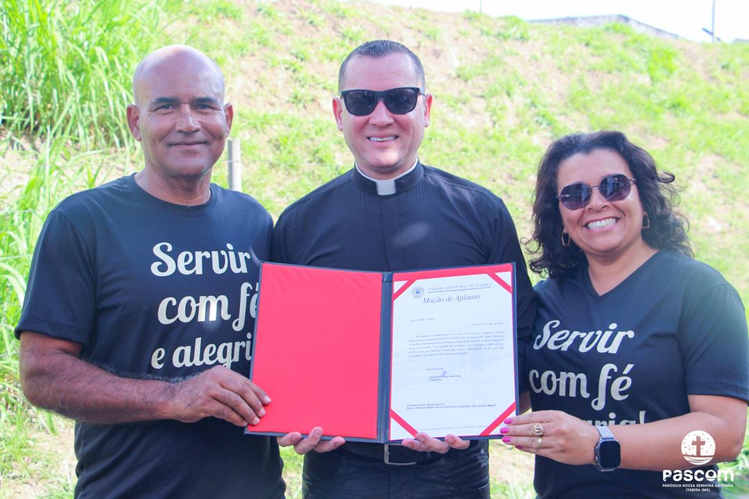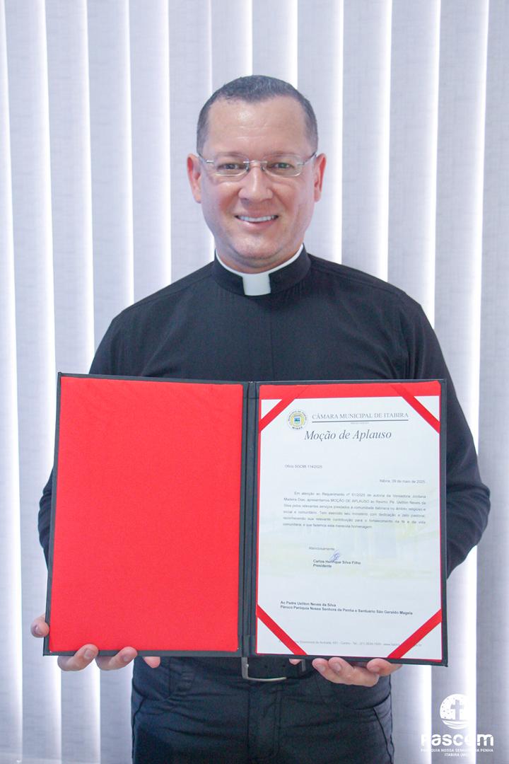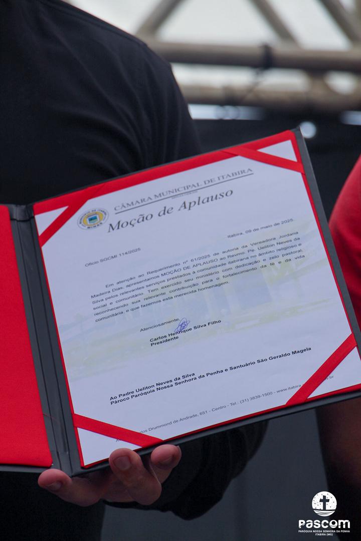 Na mesma data, às 14h, o Padre Ueliton Neves da Silva foi agraciado com uma significativa Moção de Aplausos, concedida pela Câmara Municipal de Itabira, em reconhecimento ao seu trabalho pastoral, social e missionário desenvolvido ao longo dos anos na cidade.