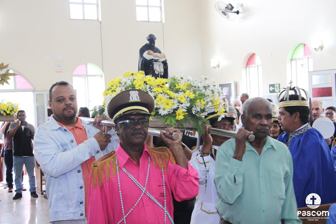 Às 11 horas, foi celebrada a Santa Missa, pelo padre Ueliton Neves da Silva, momento central da festa, reunindo a comunidade, os grupos convidados e os fiéis em um espírito de fé, comunhão e ação de graças. Após a Missa, foi servido um almoço comunitário, proporcionando um espaço fraterno de convivência. Na parte da tarde, a celebração foi concluída com o descendimento das bandeiras de Santa Efigênia e de São Benedito, encerrando o festejo com reverência e gratidão.