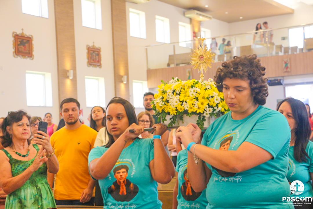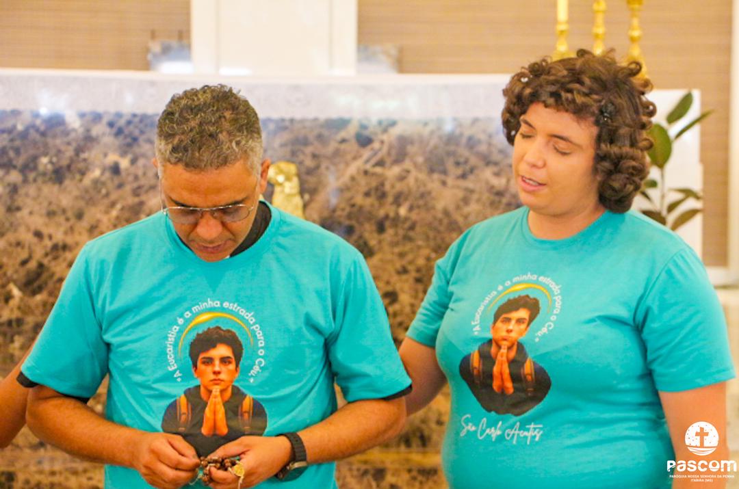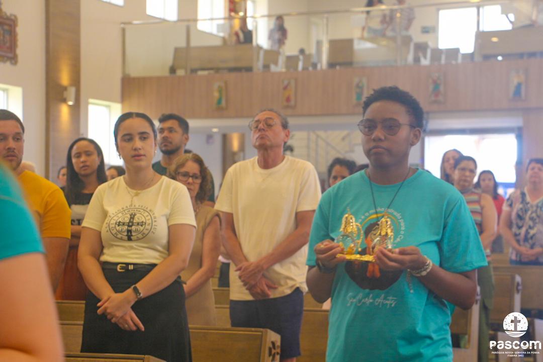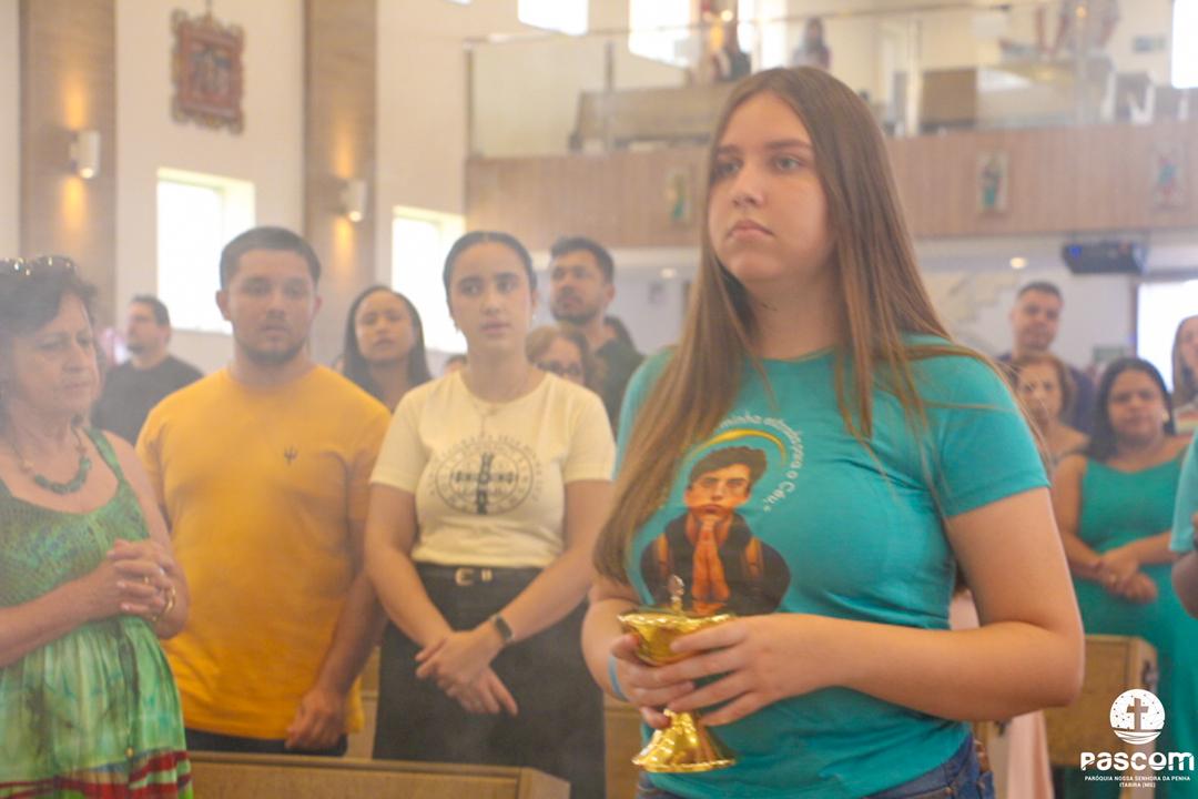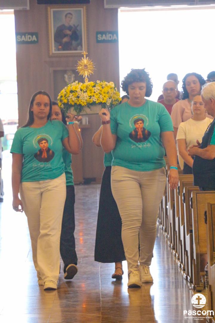 Com a presença do missionário da Obra Evangelizar, Danilo Dyba, os jovens iniciaram o encontro com um momento de louvor e, em procissão, conduziram a relíquia de São Carlo Acutis para o Santuário, onde foi celebrada a santa missa, presidida pelo Pe. Ueliton Neves, pároco. Ao final, a relíquia foi entronizada no nicho para veneração pública de todos quantos vieram ao Santuário. Em sua homilia, Pe. Ueliton iniciou dizendo “hoje é festa no céu e festa na terra, pois este Santuário, dedicado a um jovem santo, São Geraldo, e que abriga sua relíquia de primeiro grau, exposta para veneração, agora conta com a relíquia de outro jovem santo, São Carlo Acutis, que morrera no Hospital San Gerardo, na Itália”. Seguiu convidando a todos a olharem para São Carlo Acutis, um adolescente dos nossos dias, apaixonado por Jesus e pronto a dar tudo por Ele.