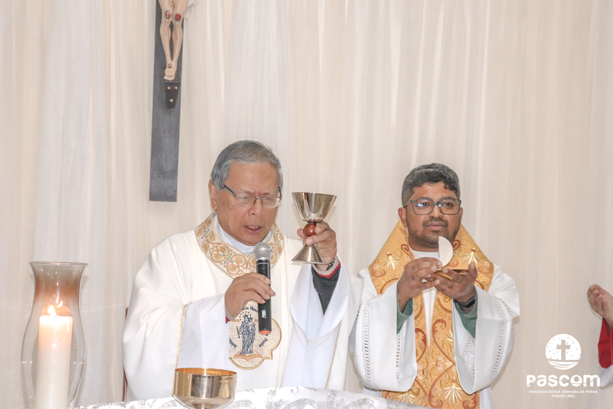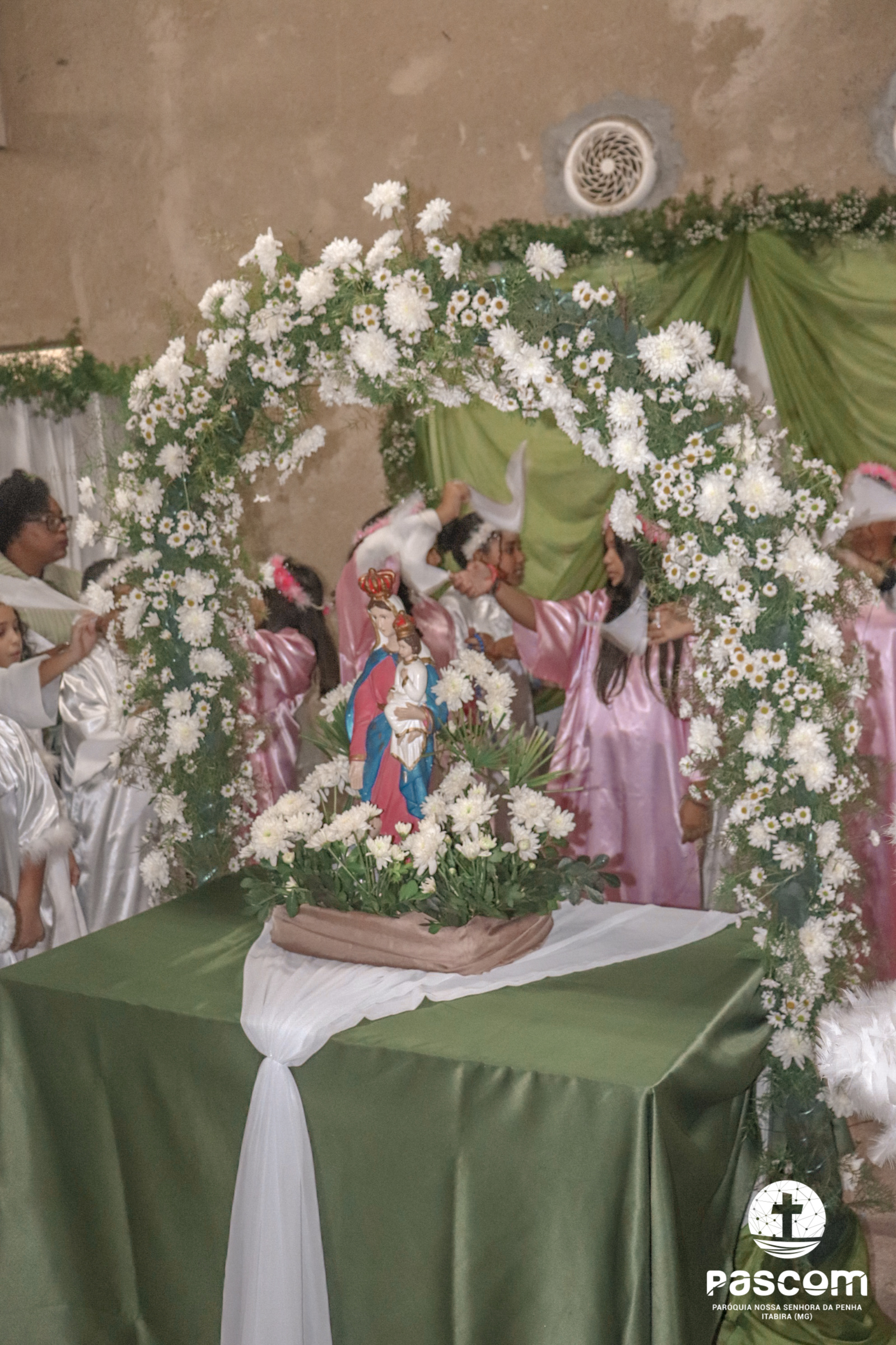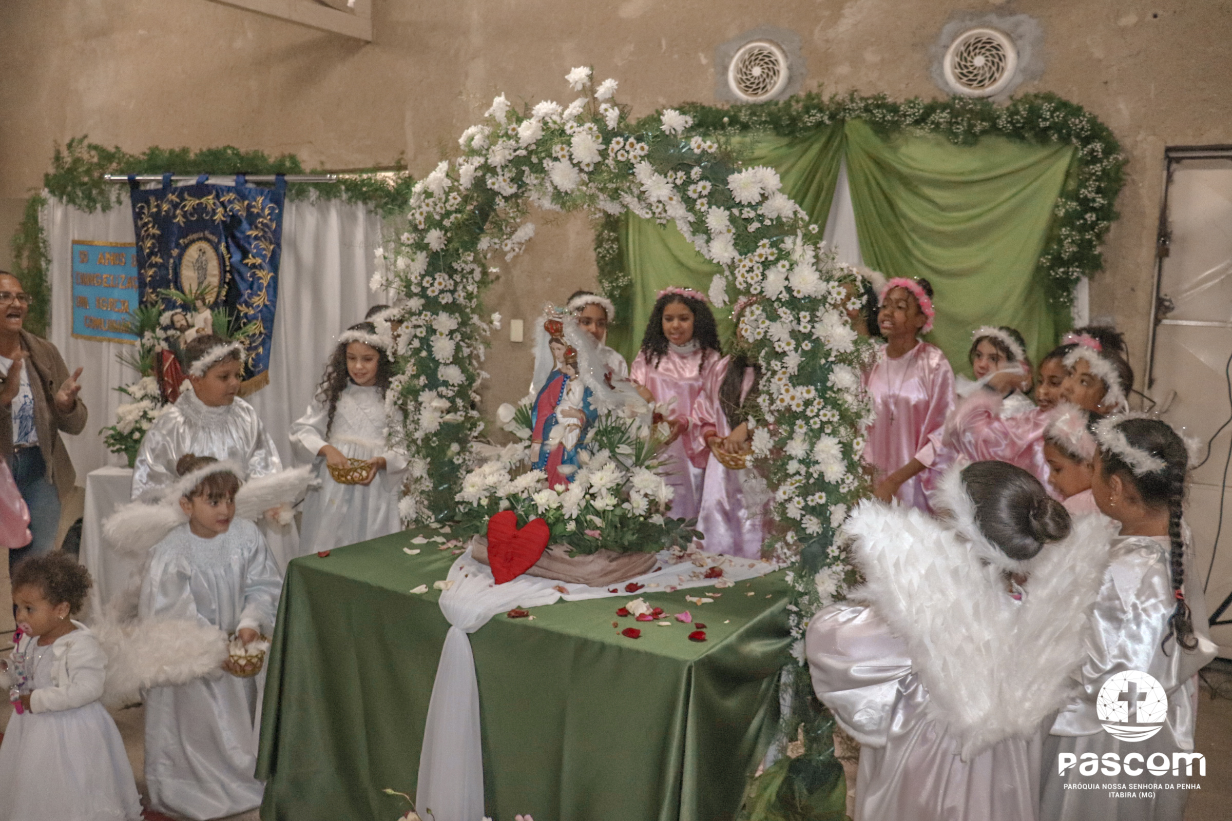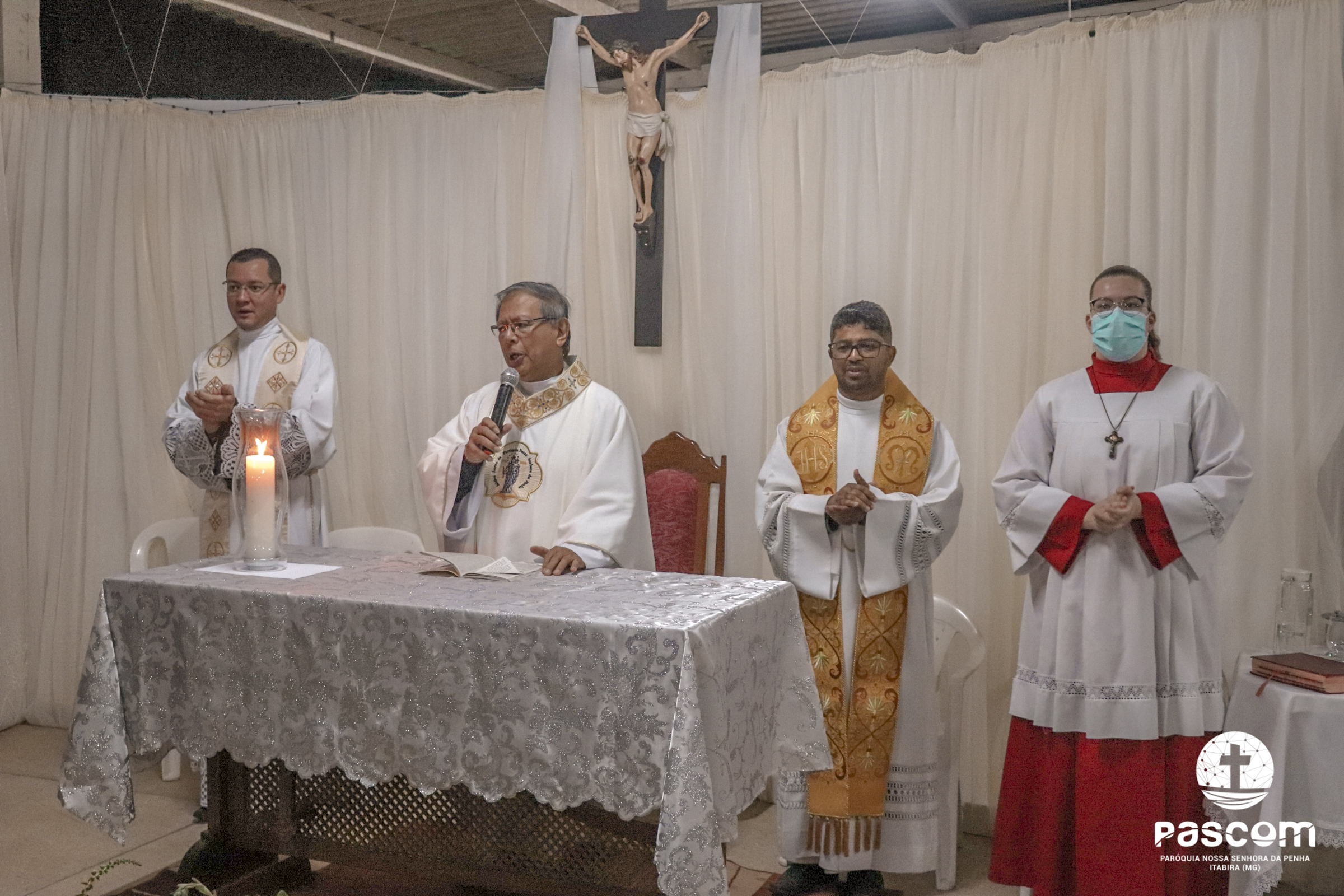 A Santa Missa foi presidida pelo Pe. Daniel Rillela Orpilla, da Congregação do Imaculado Coração de Maria, que presidiu a primeira missa na Comunidade quando a Paróquia era administrada pela referida Congregação e concelebrada pelos padres Ueliton Neves, pároco, e Edson Vander, vigário paroquial.  A celebração contou com a presença de muitos fiéis representando as comunidades e pastorais existentes na Paróquia. Na ocasião se fez memória da caminhada missionária e evangelizadora da comunidade e, por estarmos no mês dedicado a Nossa Senhora, a catequese realizou uma coroação a Mãe de Deus e Nossa, venerada como a Virgem da Penha.