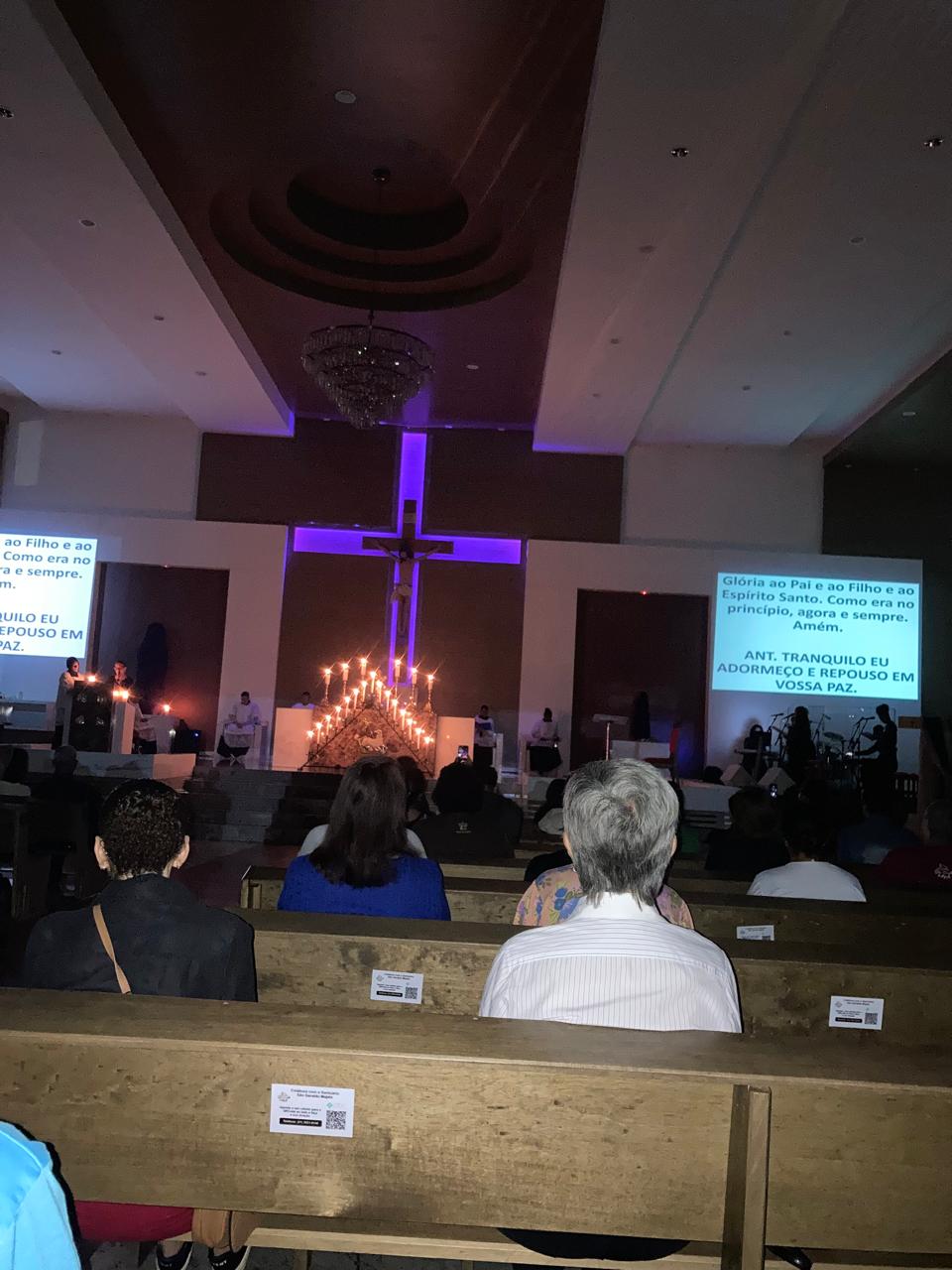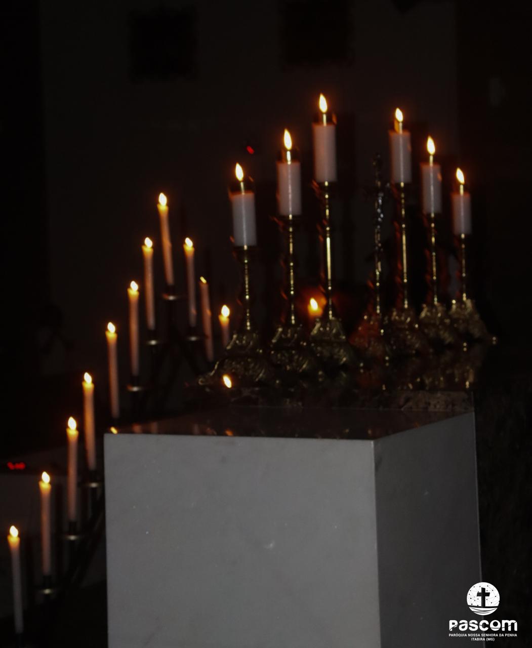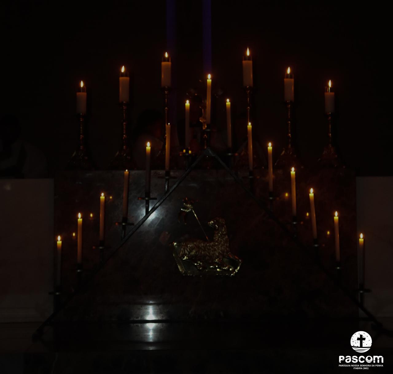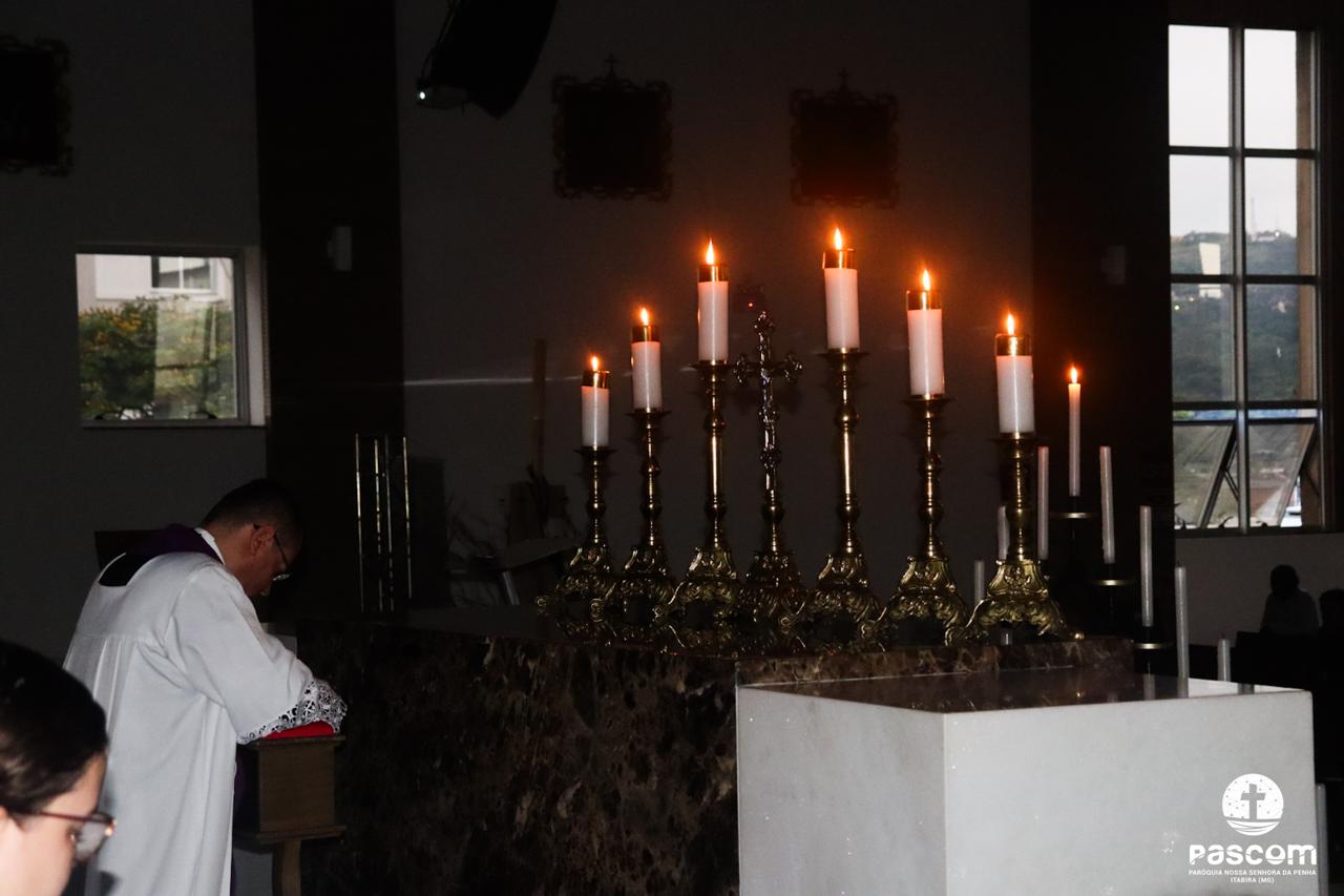 Contemplando as celebrações durante a semana santa, muitos fiéis se reuniram na manhã do sábado santo, 19 de abril, às 05h, para rezarem o Ofício das Trevas. Em silêncio e profunda contemplação, com as luzes apagadas, o Altar desnudo e à sua frente um grande candelabro de 15 velas, a oração teve início com a entrada de toda a equipe litúrgica que, tão logo chegou ao presbitério, Pe. Ueliton Neves, pároco, convocou a todos para rezarem cantando “Abri meus lábios, oh Senhor”.