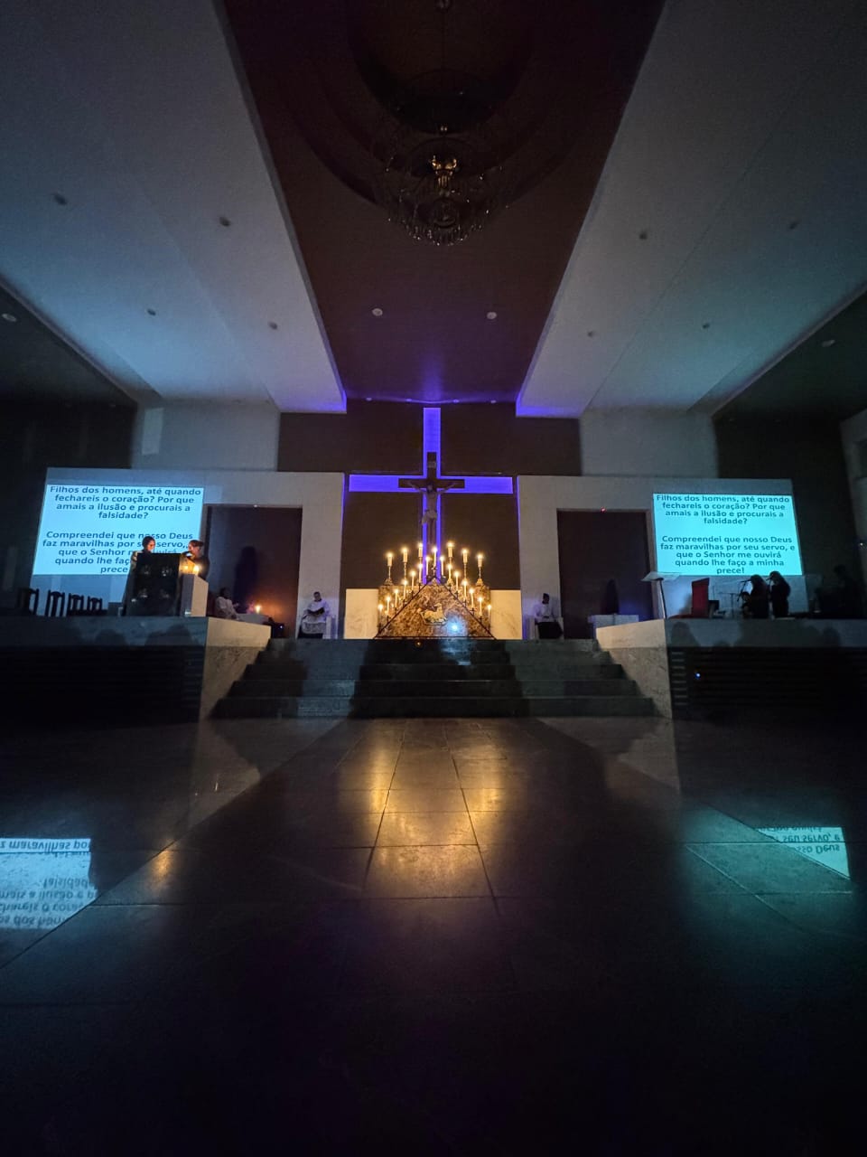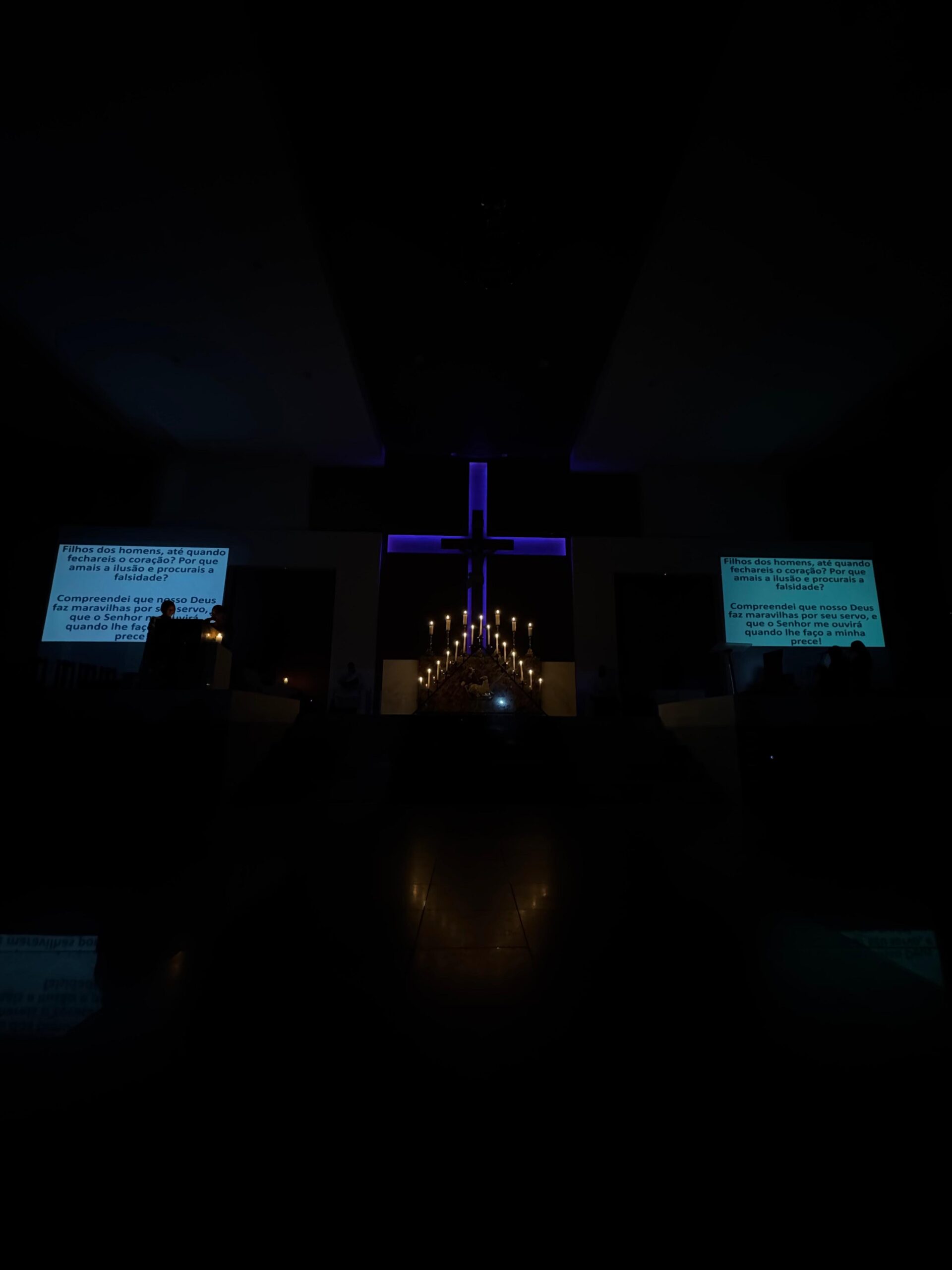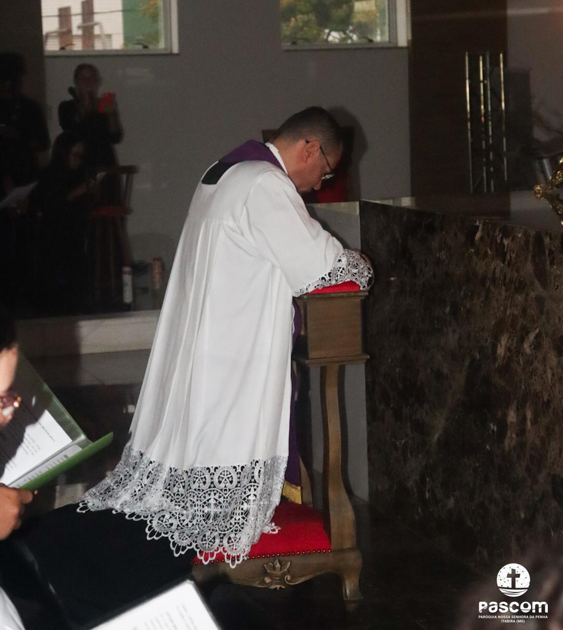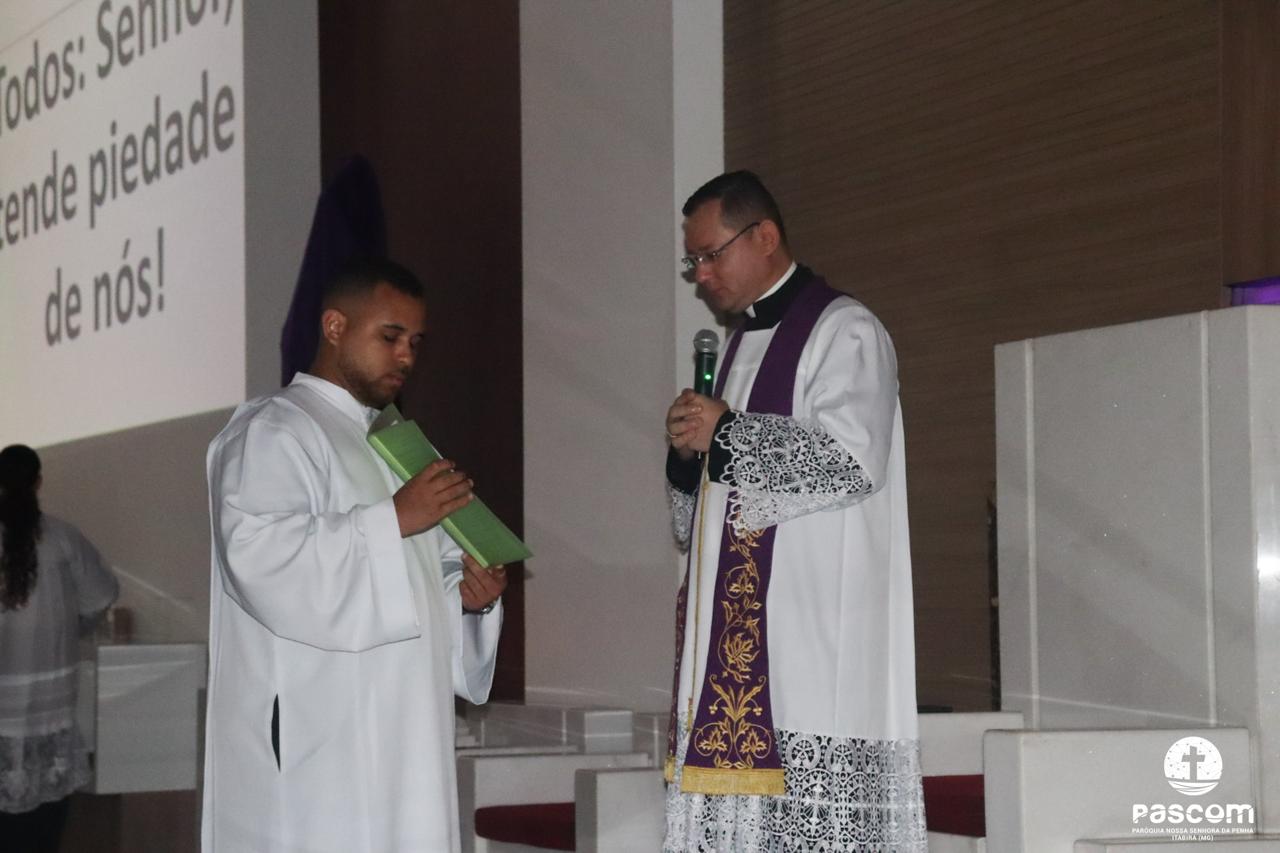 Contemplando as celebrações durante a semana santa, muitos fiéis se reuniram na manhã do sábado santo, 19 de abril, às 05h, para rezarem o Ofício das Trevas. Em silêncio e profunda contemplação, com as luzes apagadas, o Altar desnudo e à sua frente um grande candelabro de 15 velas, a oração teve início com a entrada de toda a equipe litúrgica que, tão logo chegou ao presbitério, Pe. Ueliton Neves, pároco, convocou a todos para rezarem cantando “Abri meus lábios, oh Senhor”.