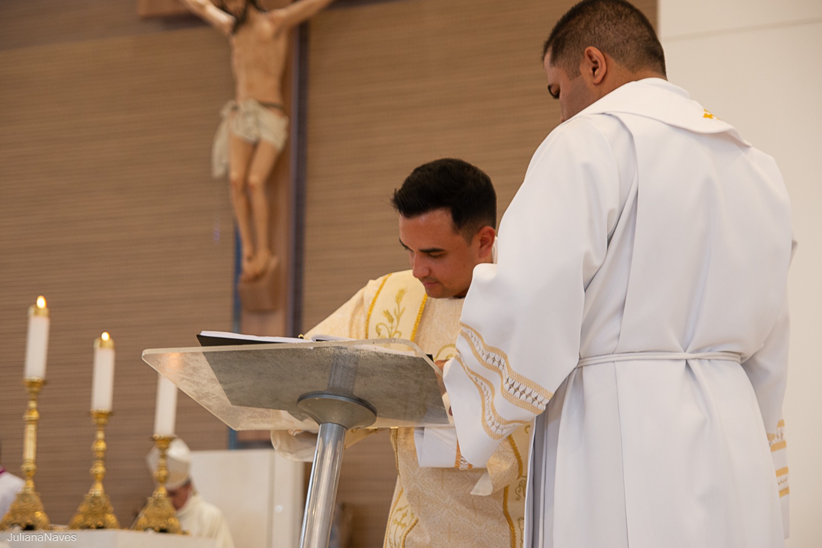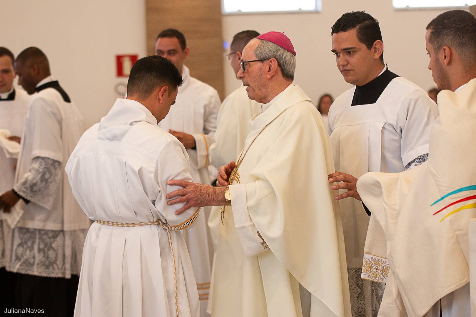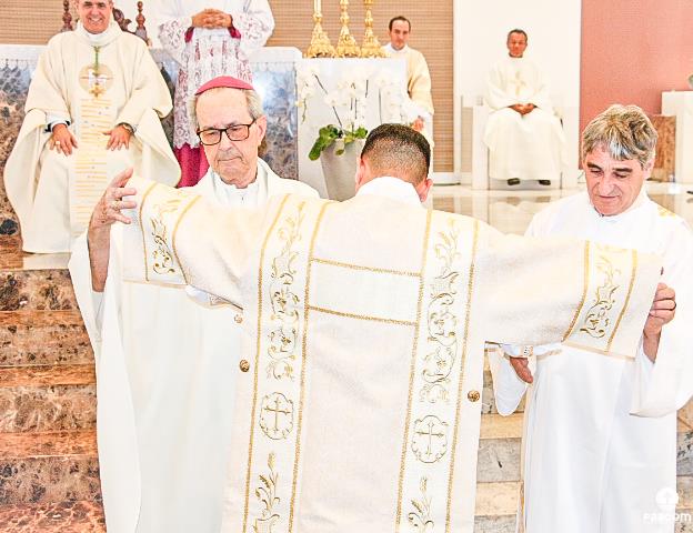 Depois, cada um dos novos diáconos foi revestido da estola e da dalmática, como sinal do serviço ministerial para o qual foram ordenados. As vestes foram levadas a cada um deles por seus pais. Júlio Cesar Santos foi revestido pelos padres Ueliton Neves e Marcos Rosa e Paulo Henrique de Souza Leal por Dom Odilon Guimarães e o Diácono Permanente Geraldo Evangelista.