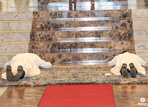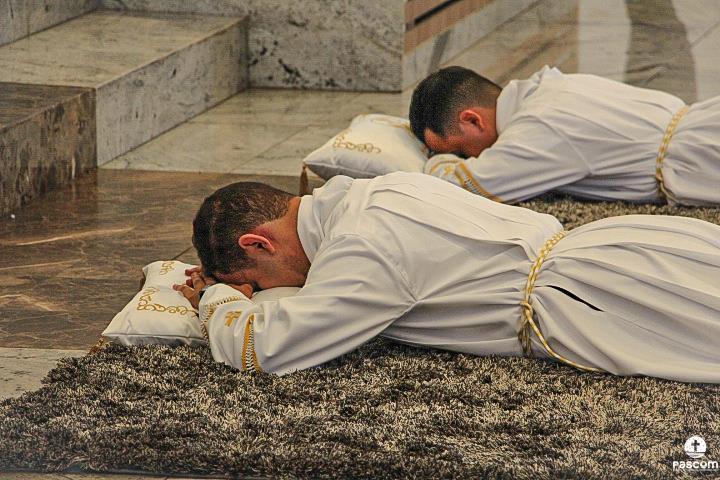Na sequência, com os diáconos prostrados diante do presbitério, foi entoada a Ladainha de Todos os Santos, após a qual se seguiu a imposição das mãos e a prece de ordenação rezada por Dom Marco Aurélio Gubiotti.